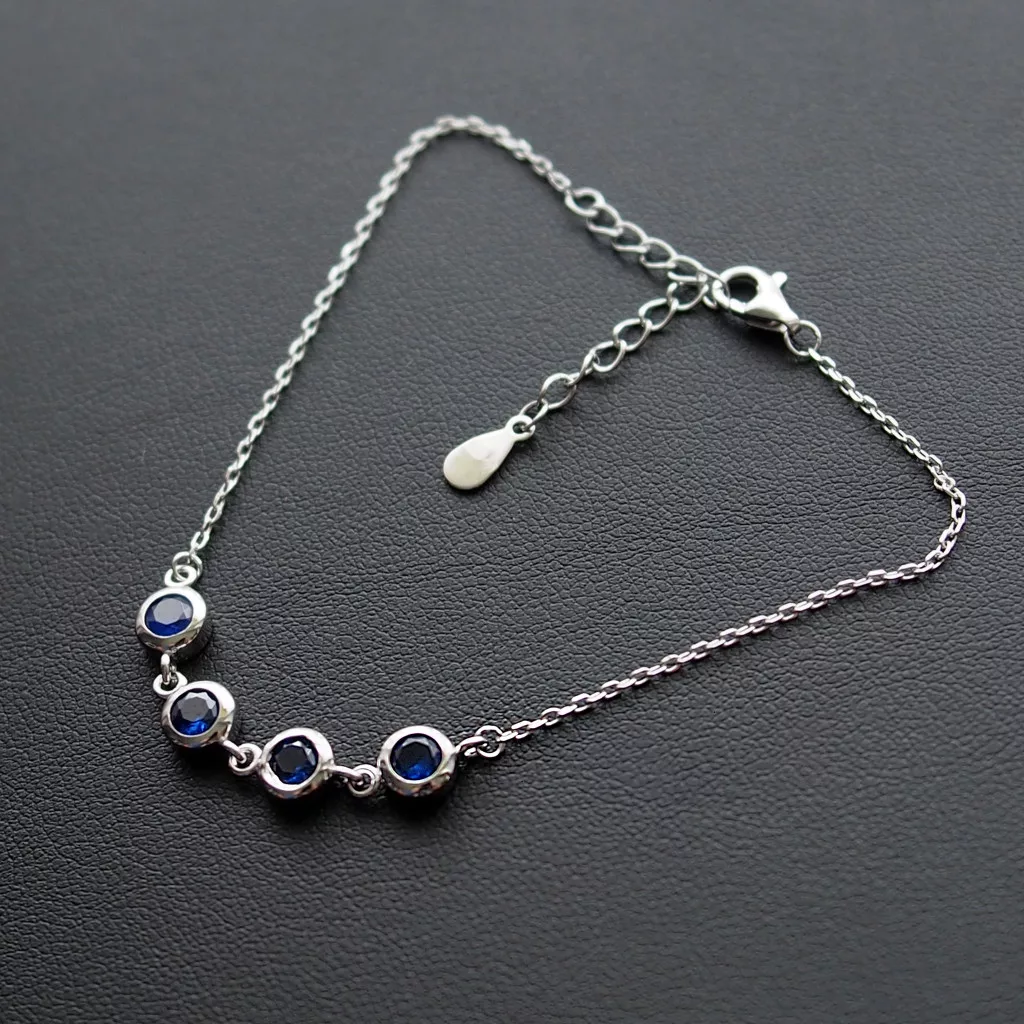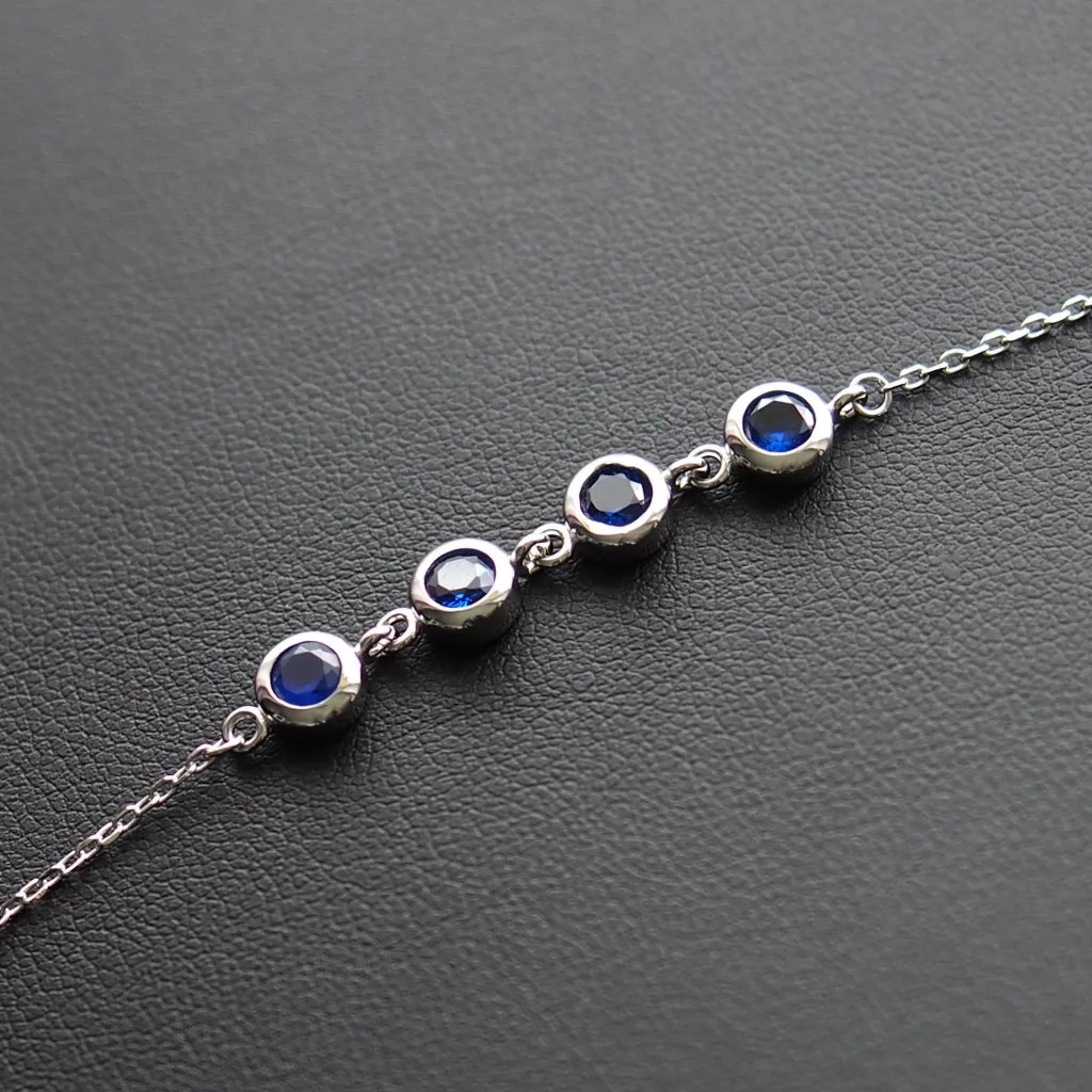 Ezüst karkötő, 4 db butonos foglalatú kék cirkónia kövel, vékony anker lánccal.