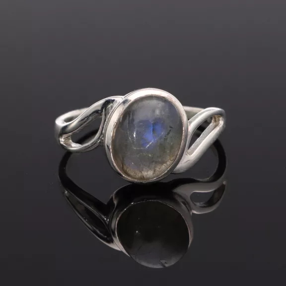 Ovális , kaboson csiszolású Labradorit gyűrű, aszimmetrikus hullámokat idéző ezüst foglalatban.