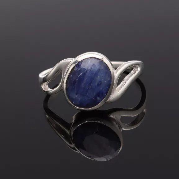 Ovális , fazettált csiszolású Zafír köves gyűrű, aszimmetrikus hullámokat idéző ezüst foglalatban.