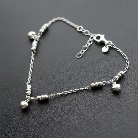 Vékony Anker szemes Ezüst karkötő, amely szakaszosan vésett golyókkal és szív alakú pici szív medálkákkal van díszítve