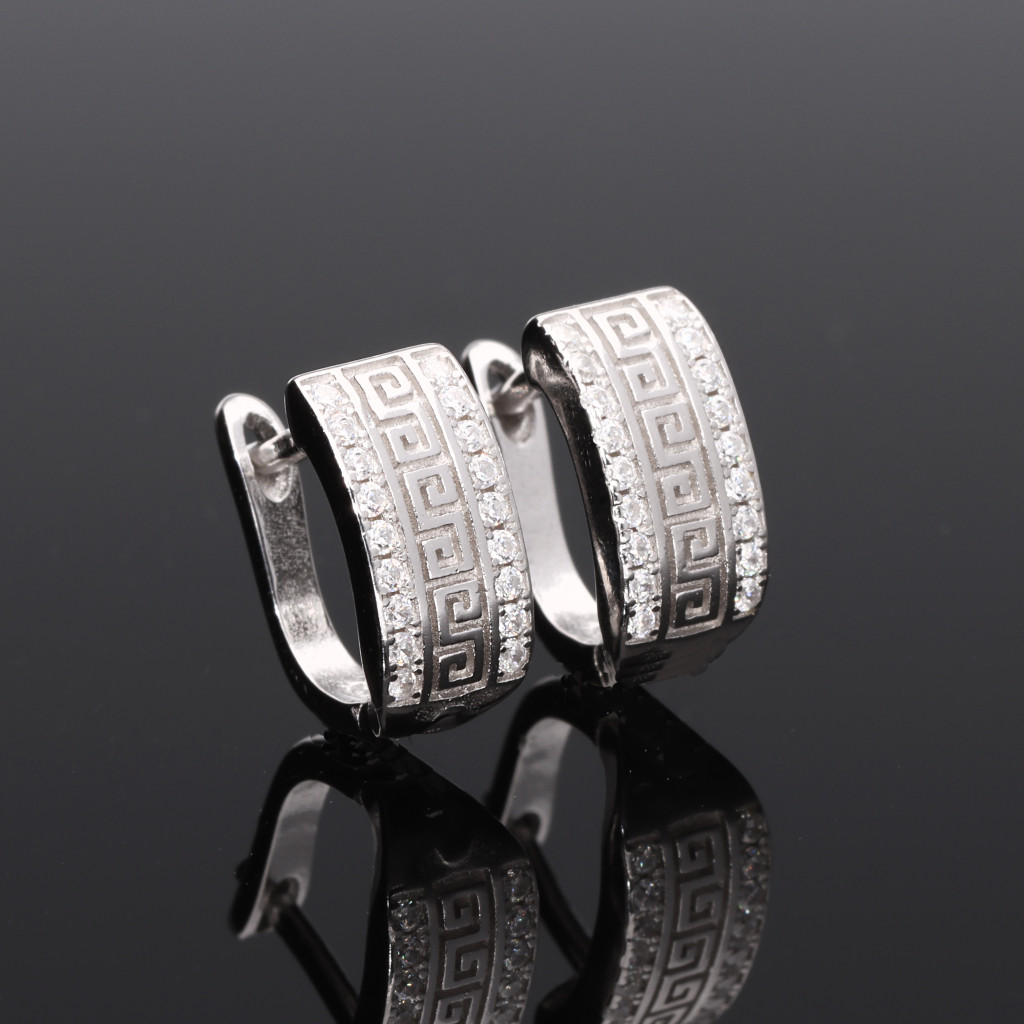 Francia kapcsos Ezüst fülbevaló, középen görög mintával, szélein cirkónia kövekkel díszítve