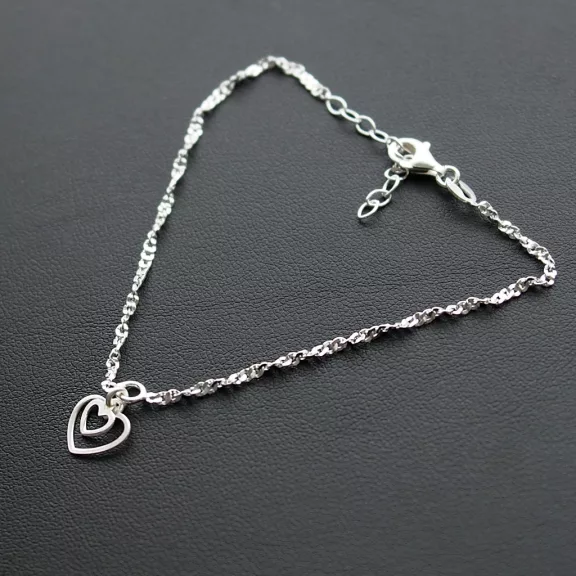 Vékony csavart Ezüst karkörő, középen dupla szív medállal