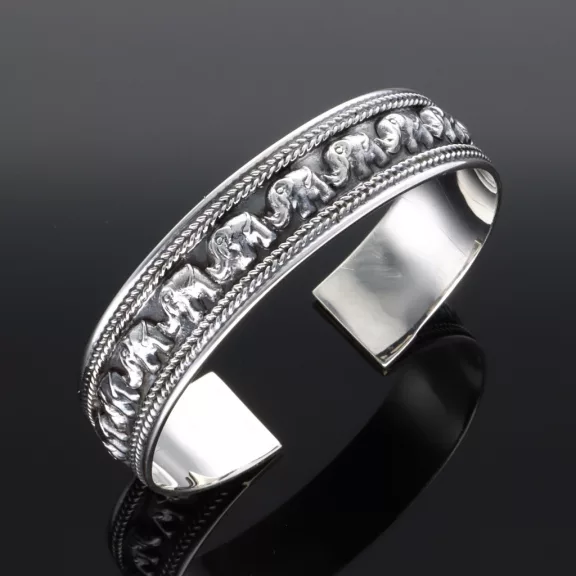 Elefántokkal díszített antikolt ezüst merev karkötő.