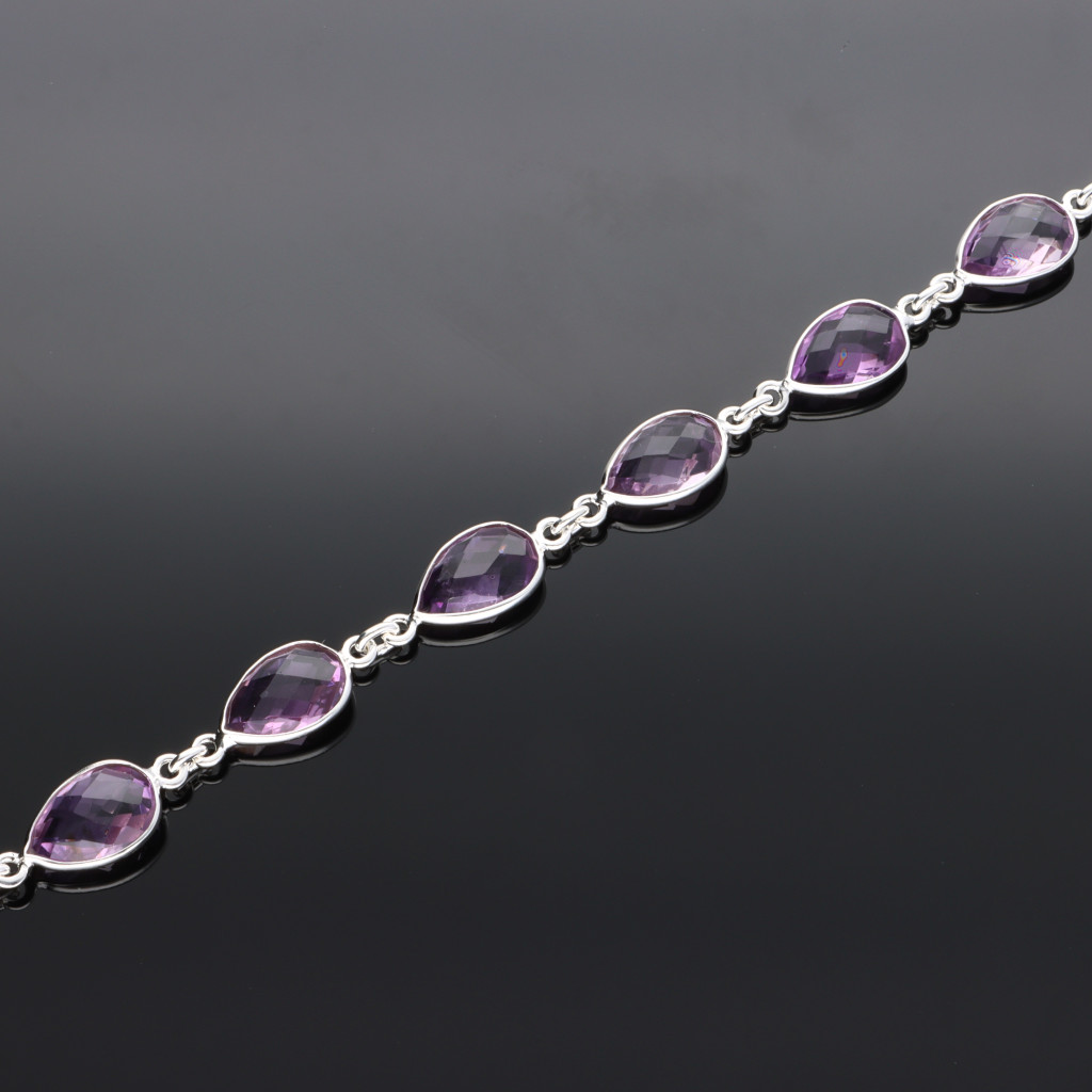 Ezüst karkötő 8 db fazettált csiszolású, csepp foromájú ametiszt kővel, sima, letisztult foglalatban