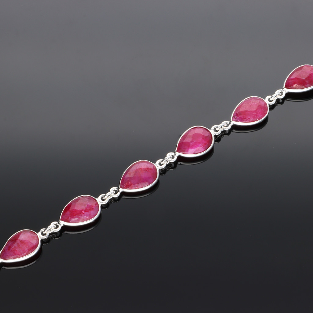 Ezüst karkötő 8 db fazettált csiszolású, zárványos, csepp foromájú Rubin kővel, sima, letisztult foglalatban