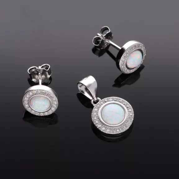 Fülbevaló és medál ékszer garnitúra, középen Szintetikus Opállal és körben apró fehér cirkónia kövekkel díszítve