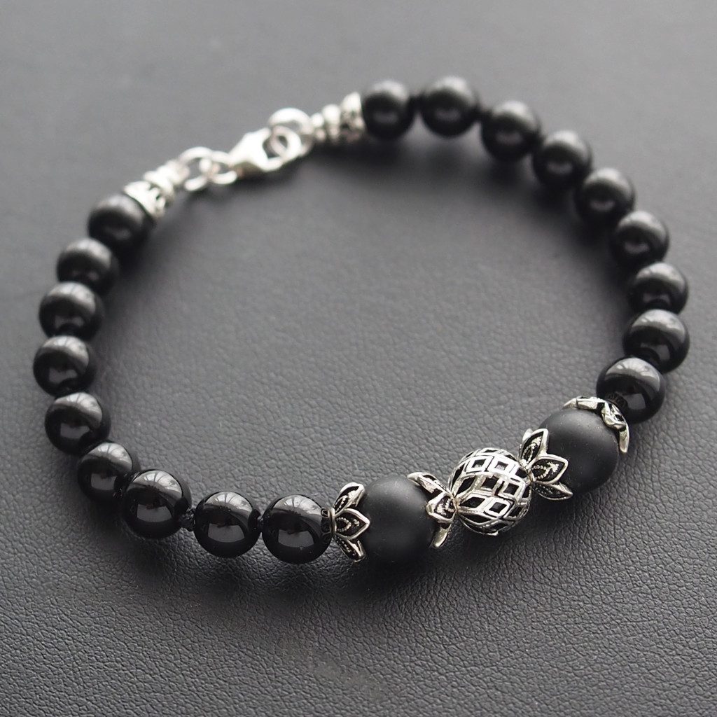 Fűzött Ónix karkötő, díszes ezüst gömbbel és lótusz formájú díszítő elemekkel, különleges antikolt ezüst zárvóéggel és zárszerkezettel