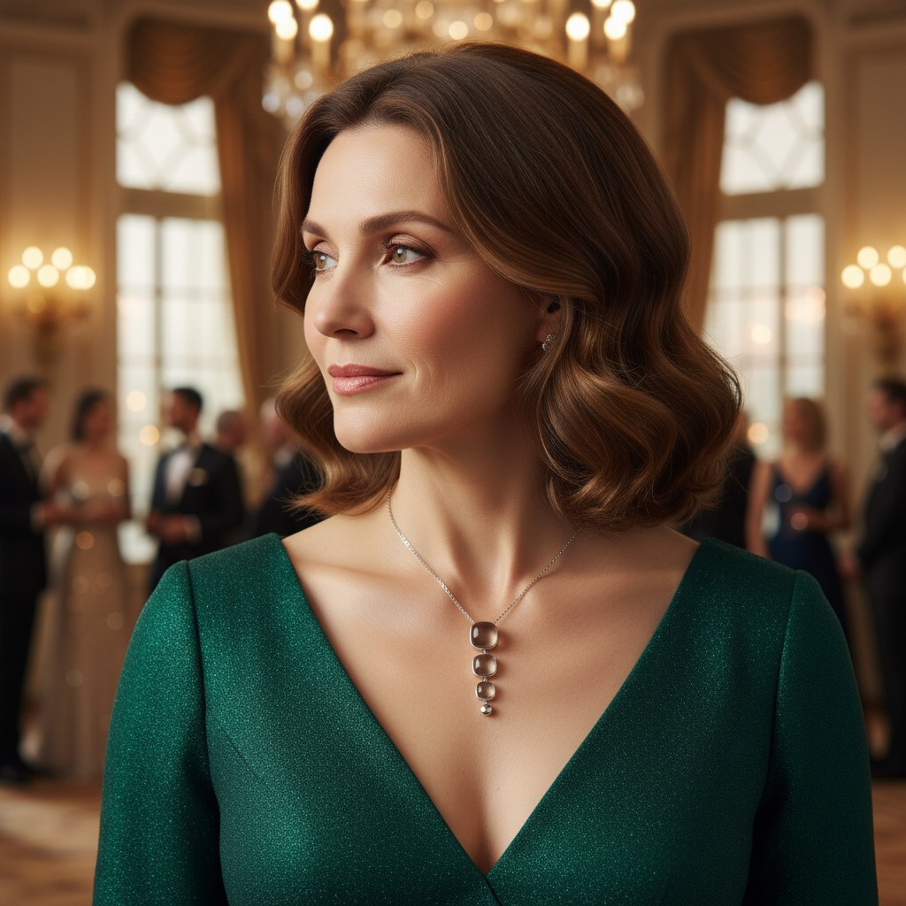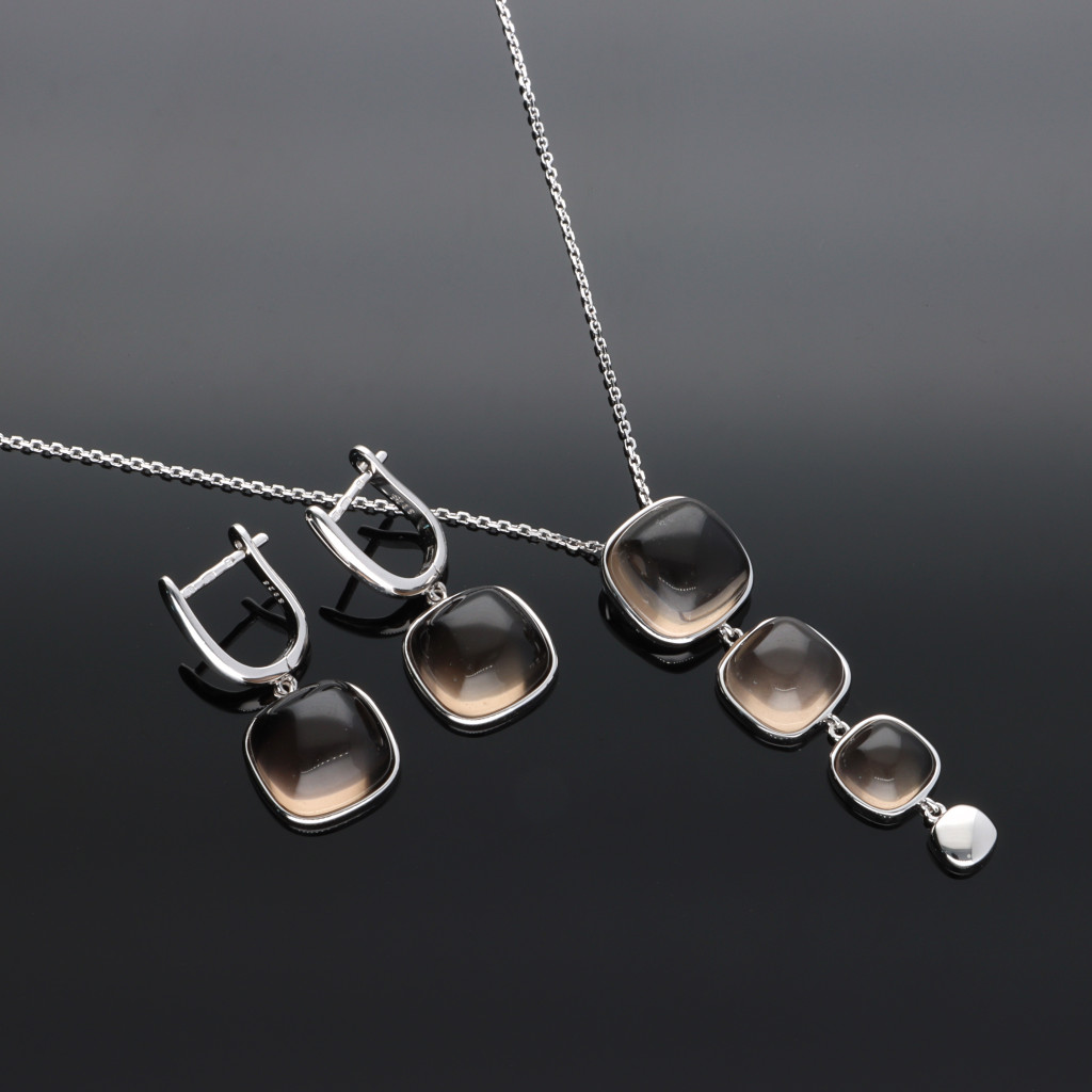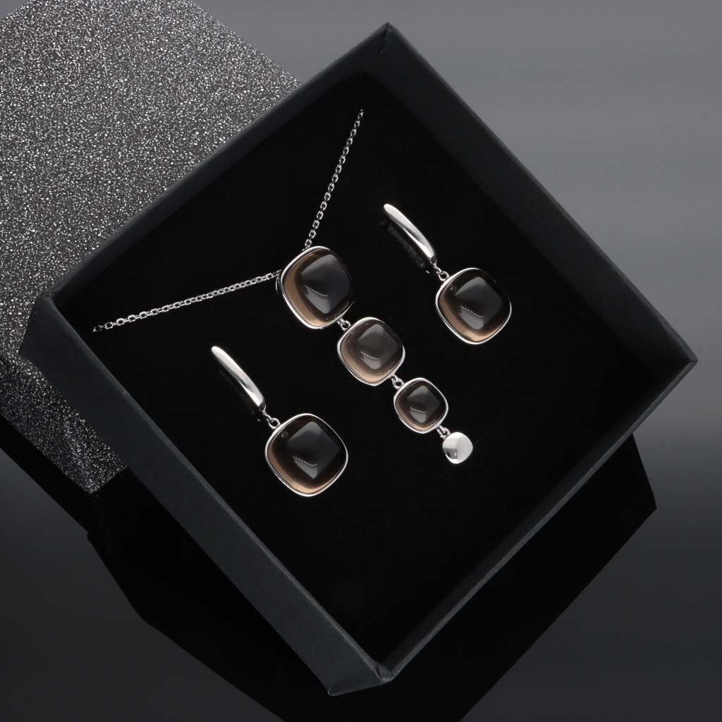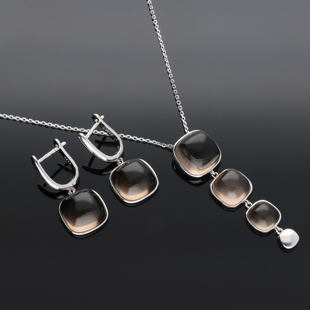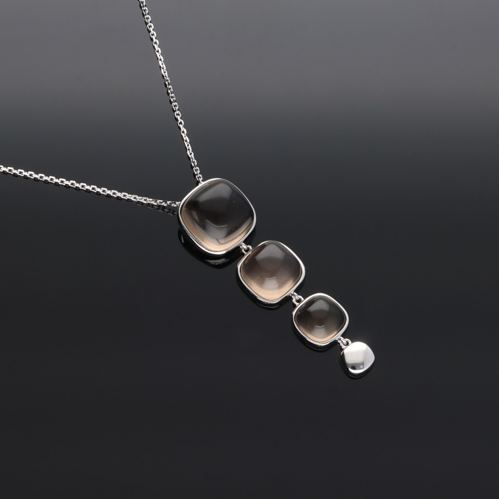 A medál 3db különböző méretű szögletes Füstkvarc ásványból és egy szögletes fényes ezüst szemből áll.