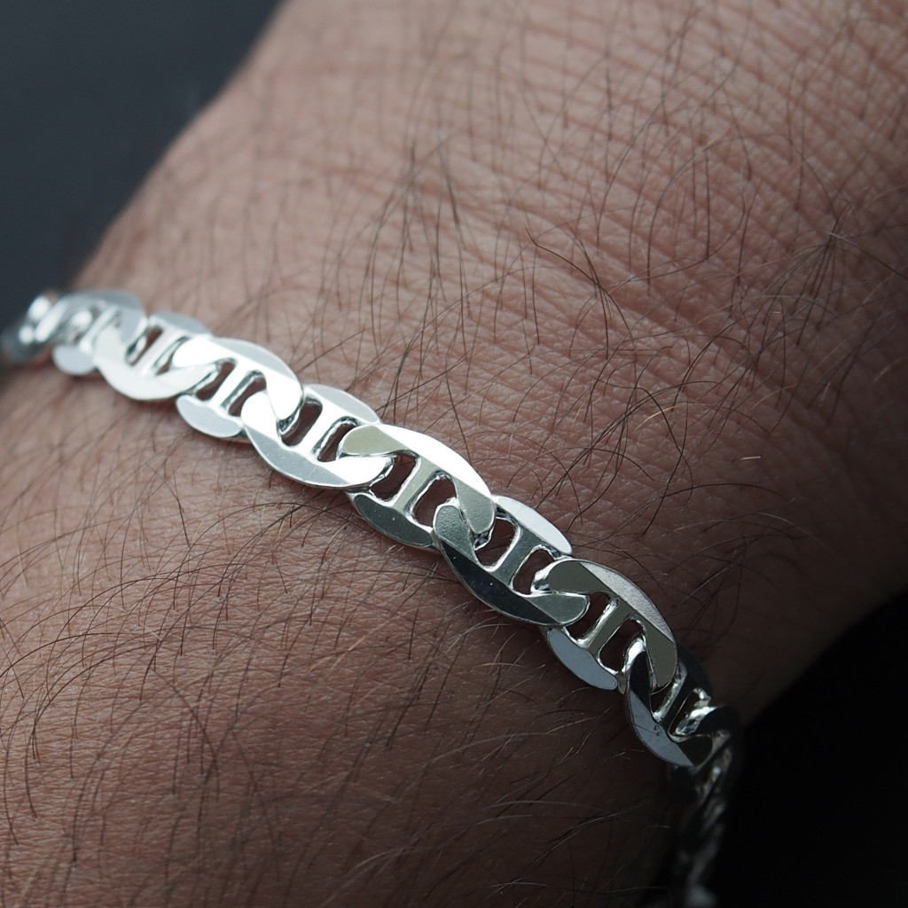 Tömör kivitelének köszönhetően erős férfi ezüst karlánc, lényegesen időtállóbb üreges társainál.