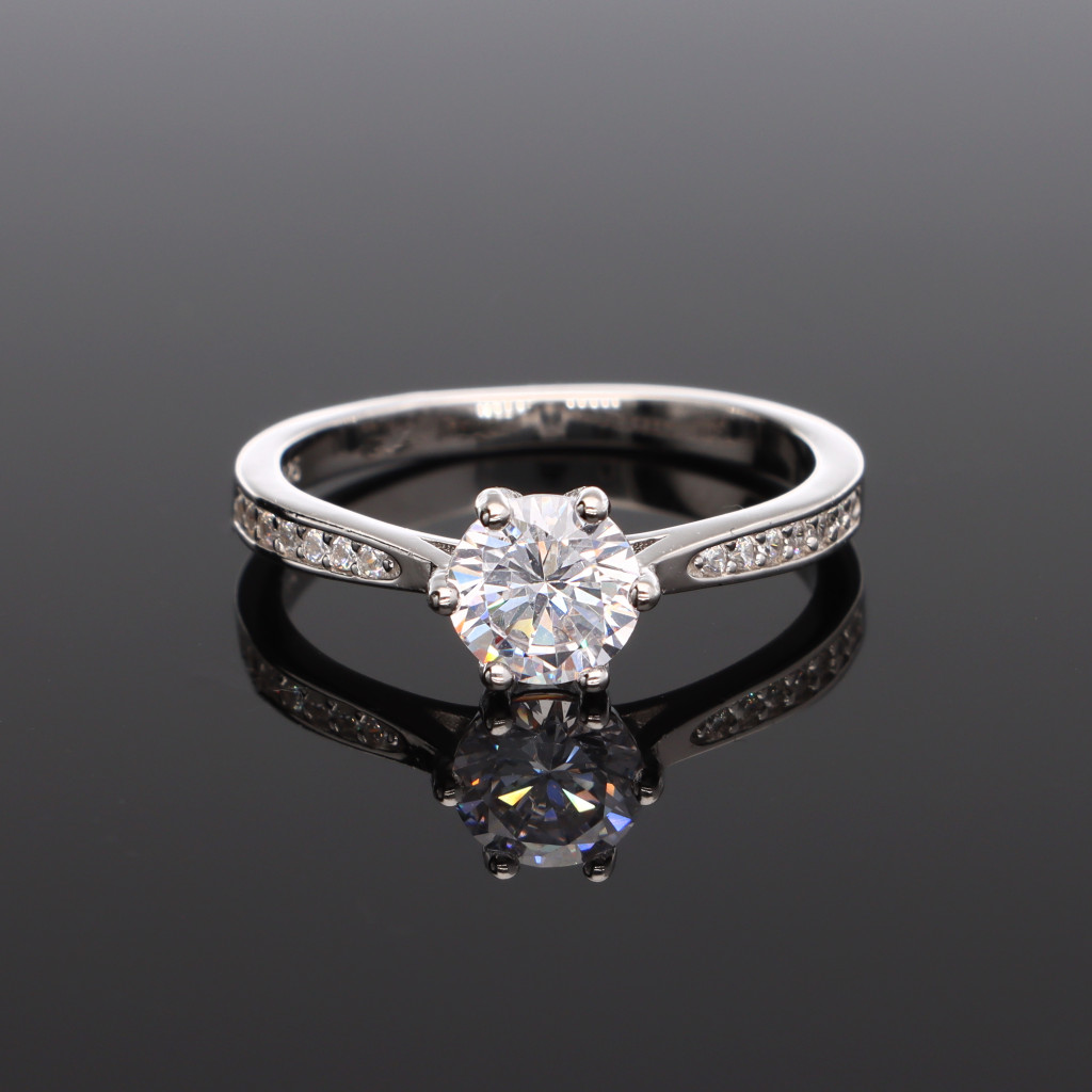 Ezüst gyűrű, egy központi nagy Cirkónia kővel karmos foglalatban és apró Cirkónia kövekkel díszített gyűrűsínnel