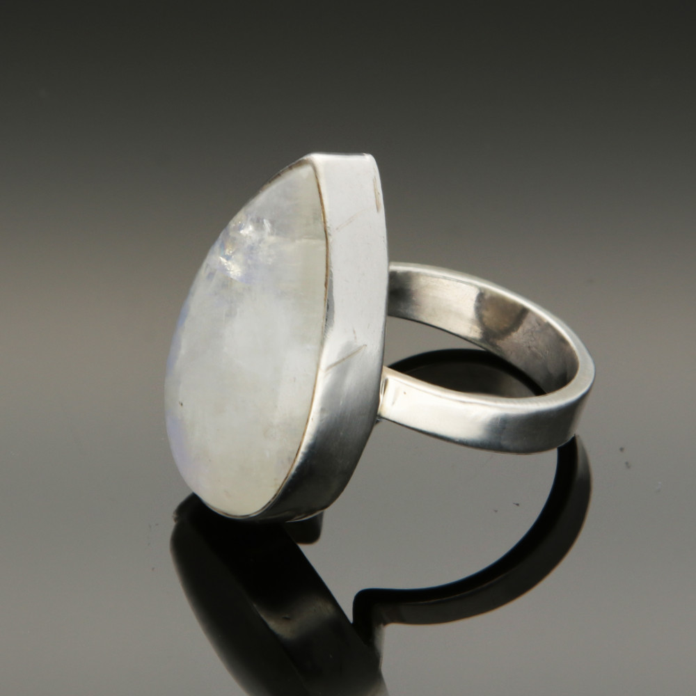 Nagy méretű, csepp formájú , kaboson  holdkő, letisztult ezüst foglalatban
