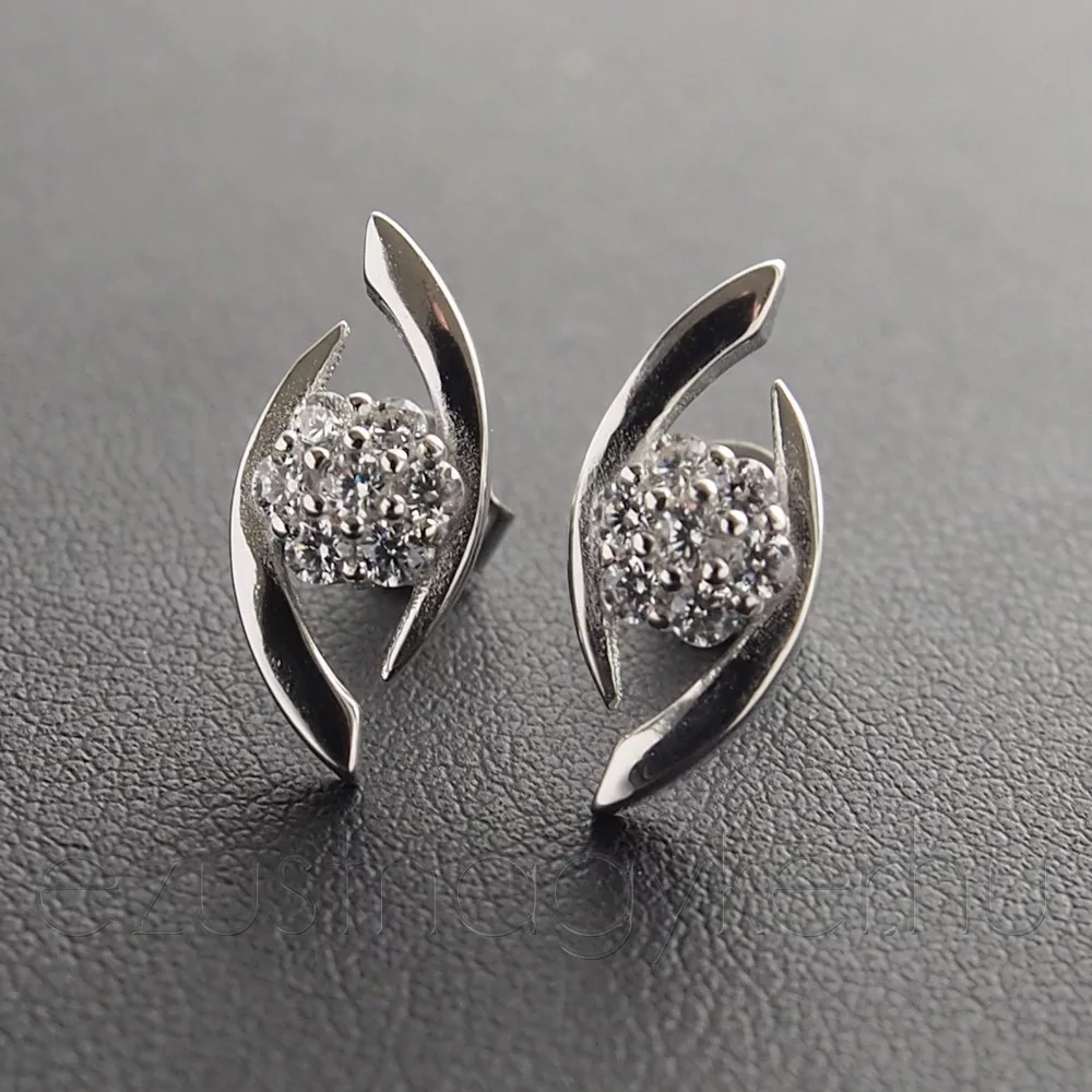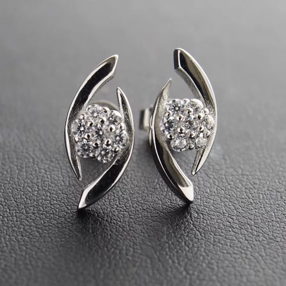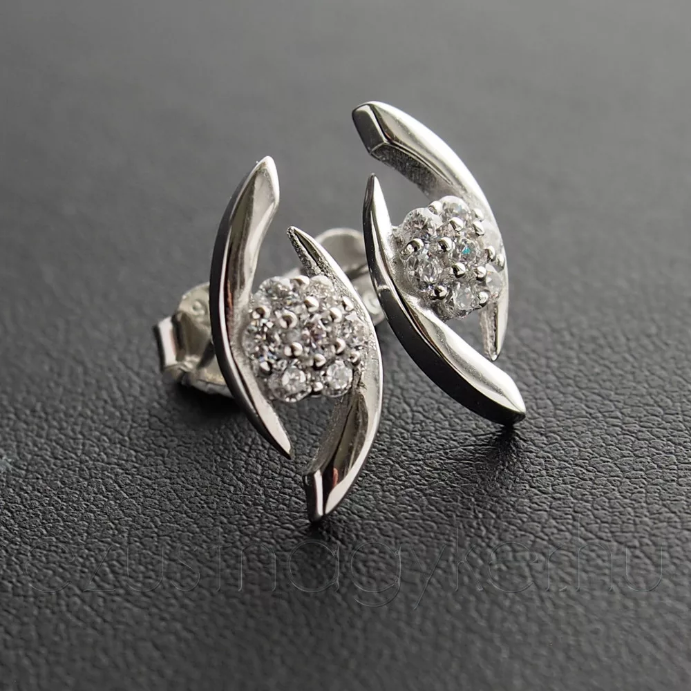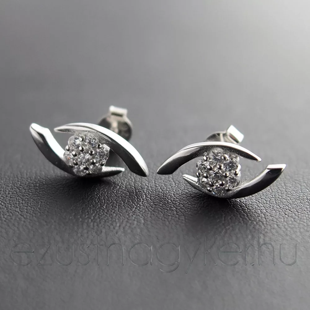 Apró cirkónia kövekkel készült virág forma, két oldalán íves elemmel, bedugós ezüst fülbevaló szerkezettel