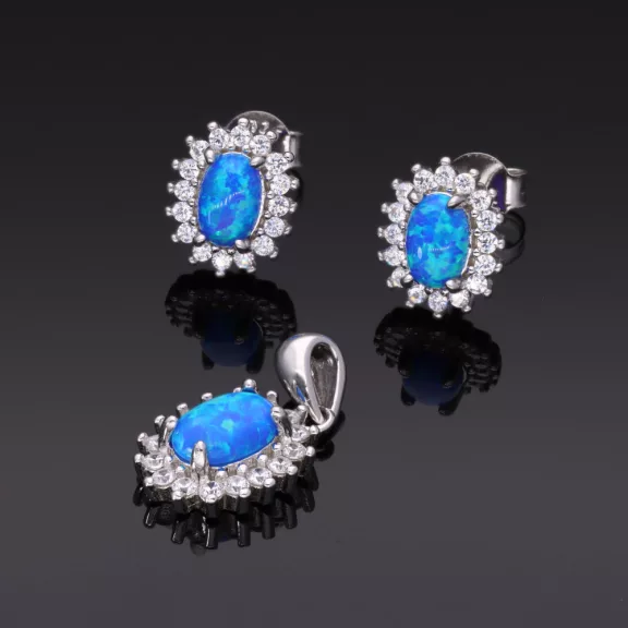 Eüst Medál - Fülbevaló Garnitúra, ováls, kék színű opál kővel, melynek foglalata körben fehér, karmos foglalatú cirkónia kövekkel van díszítve.