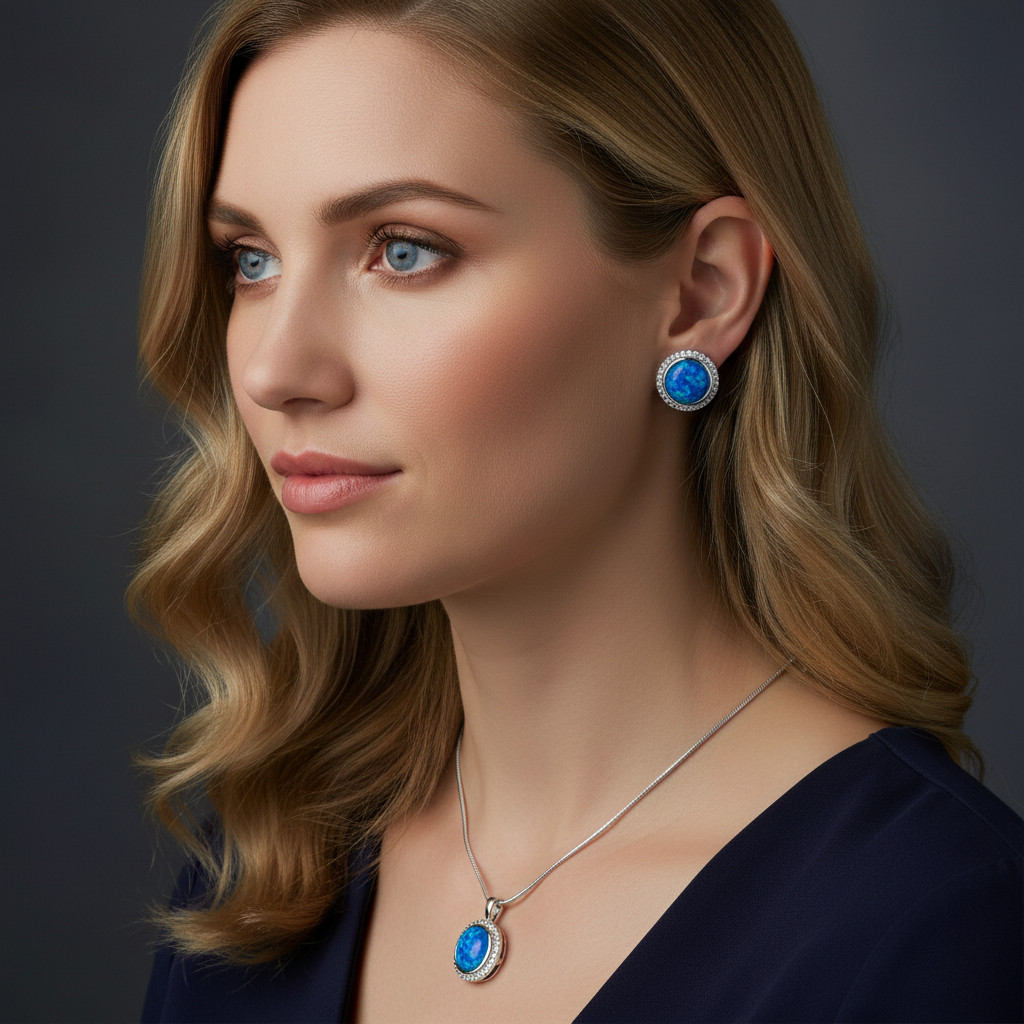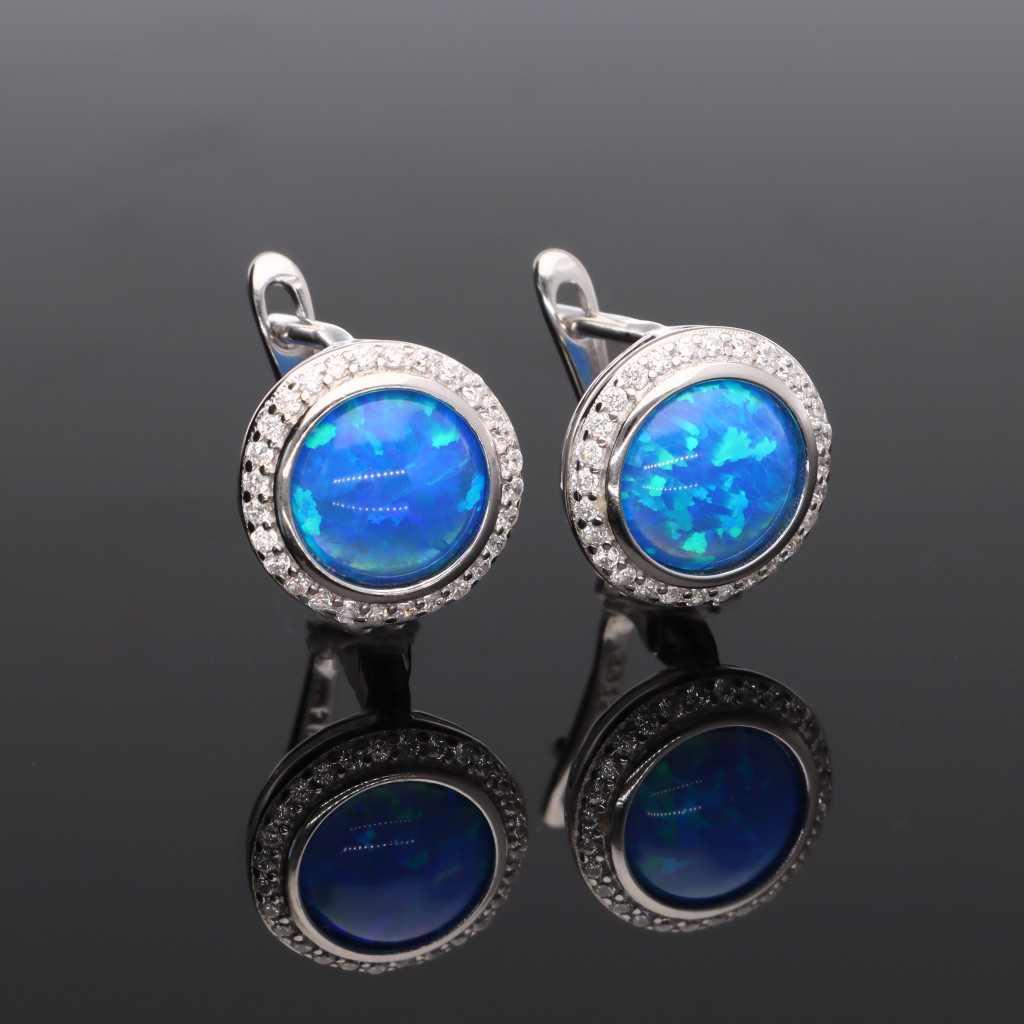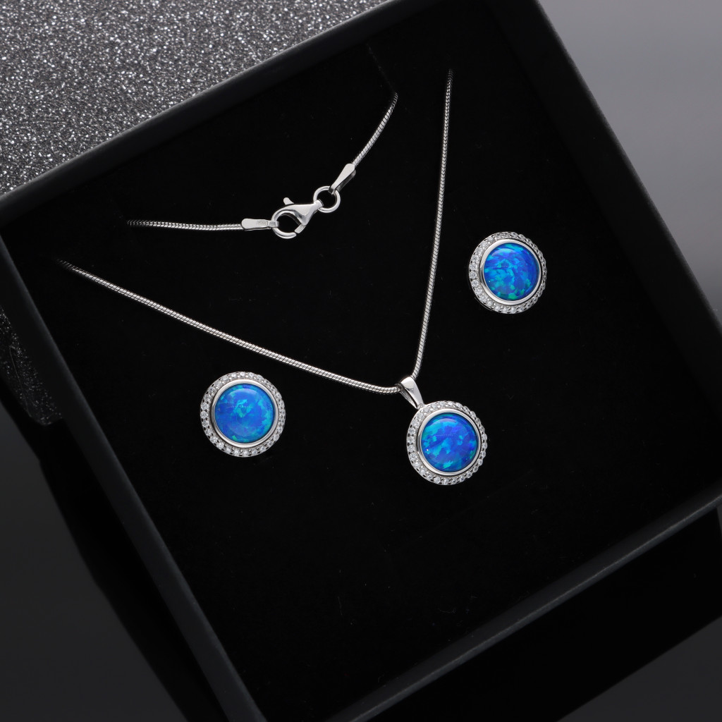 Eüst fülbevaló, medál Garnitúra, kék színű kerek Szintetikus Opál kővel, körben apró Cirkónia kövekkel díszítve, rhódiumos kígyó lánccal