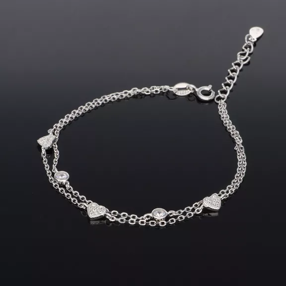 Cirkónia köves Szivekkel, és butonos cirkónia kővekkel díszített két soros ezüst anker szemes karkötő.