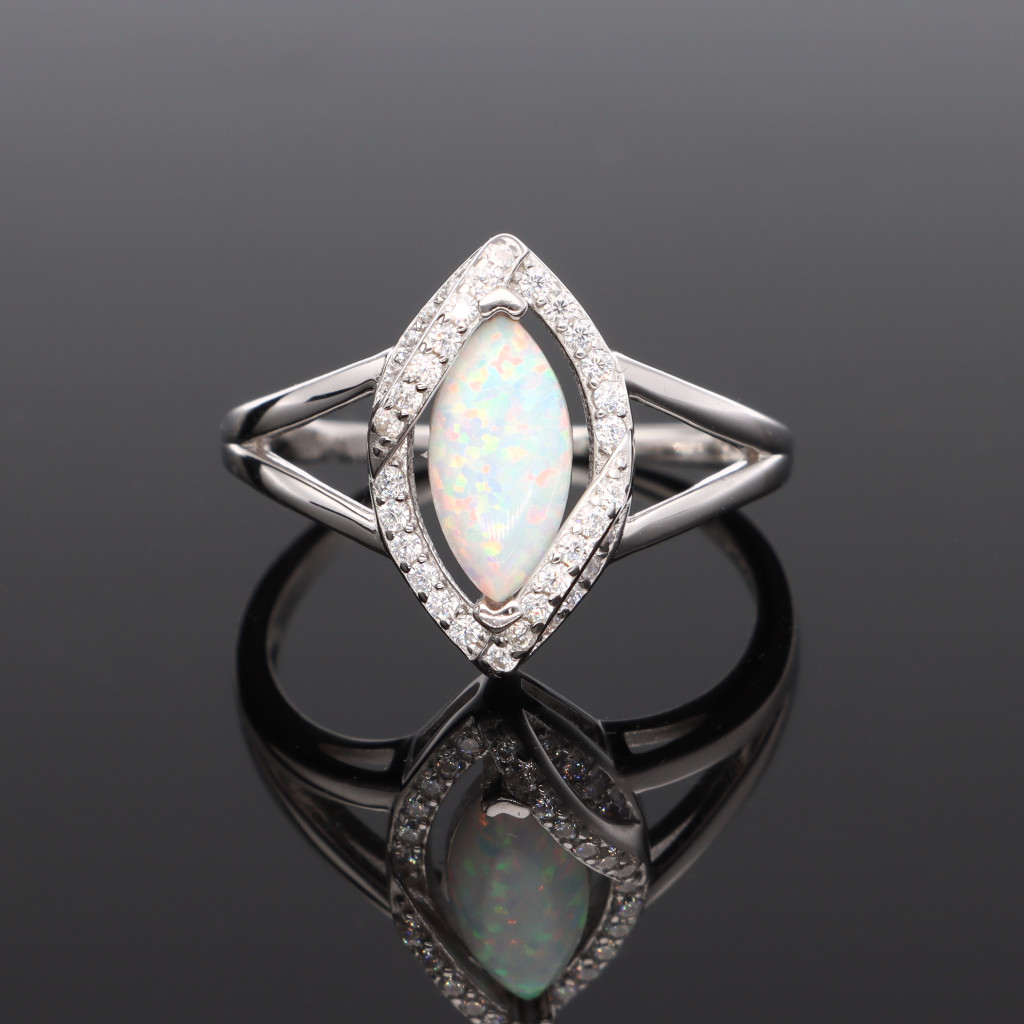 Ezüst gyűrű, navett formájú szintetikus Opállal, körben apró, fehér cirkóniával díszítve, V alakban nyitott gyűrűsínnel