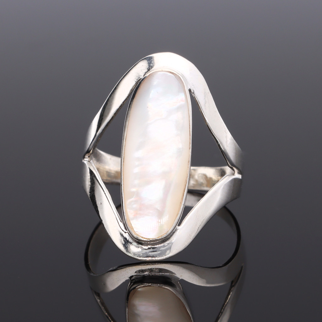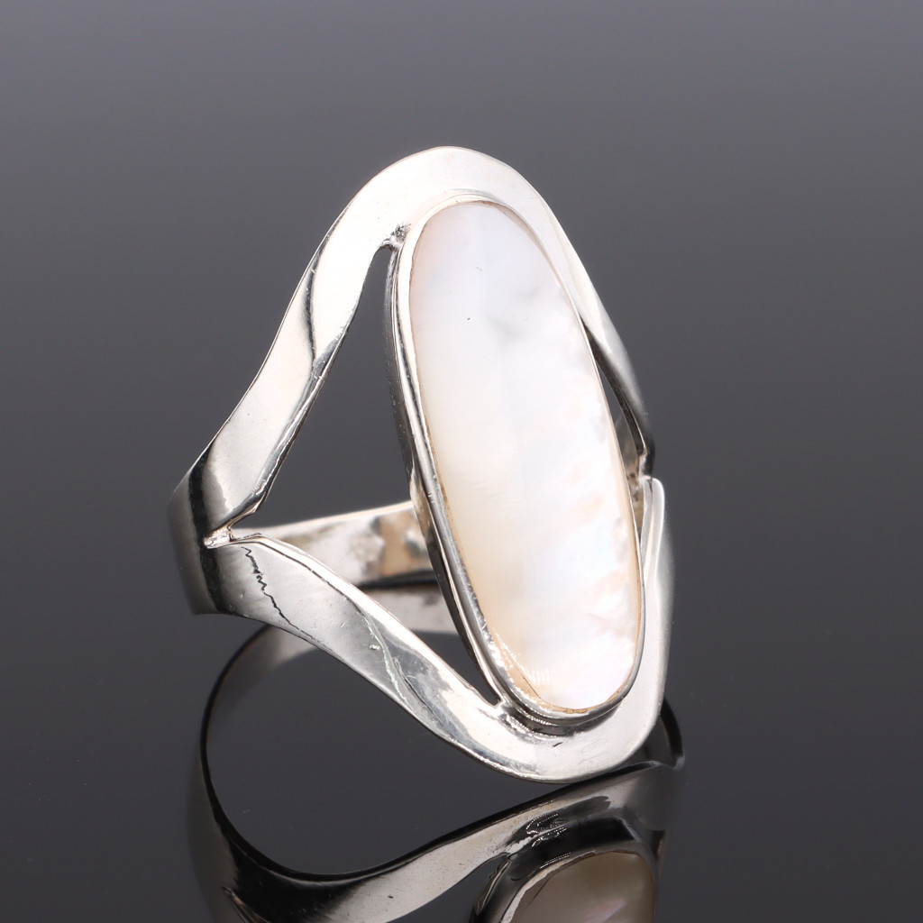 Ezüst gyűrű, hosszúkás ovális formájú gyöngyházzal, modern kivitelben