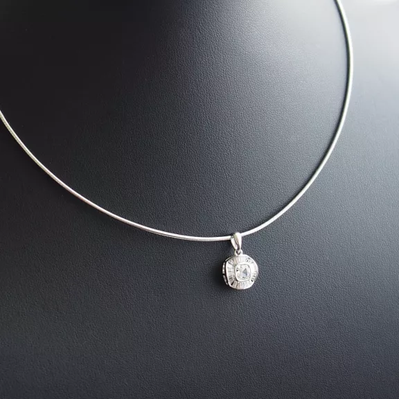 Ezüst medál, középen egy nagyobb négyszögletű és körben trapéz alakú Cirkónia kövekkel díszítve, félmerev ezüst láncon