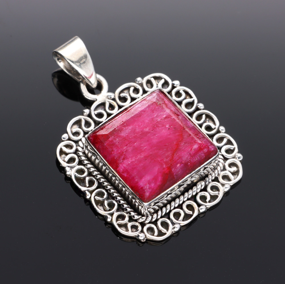 Négyzetes rubin köves medál, díszes, antikolt ezüst foglalatban, fazettált csiszolással.