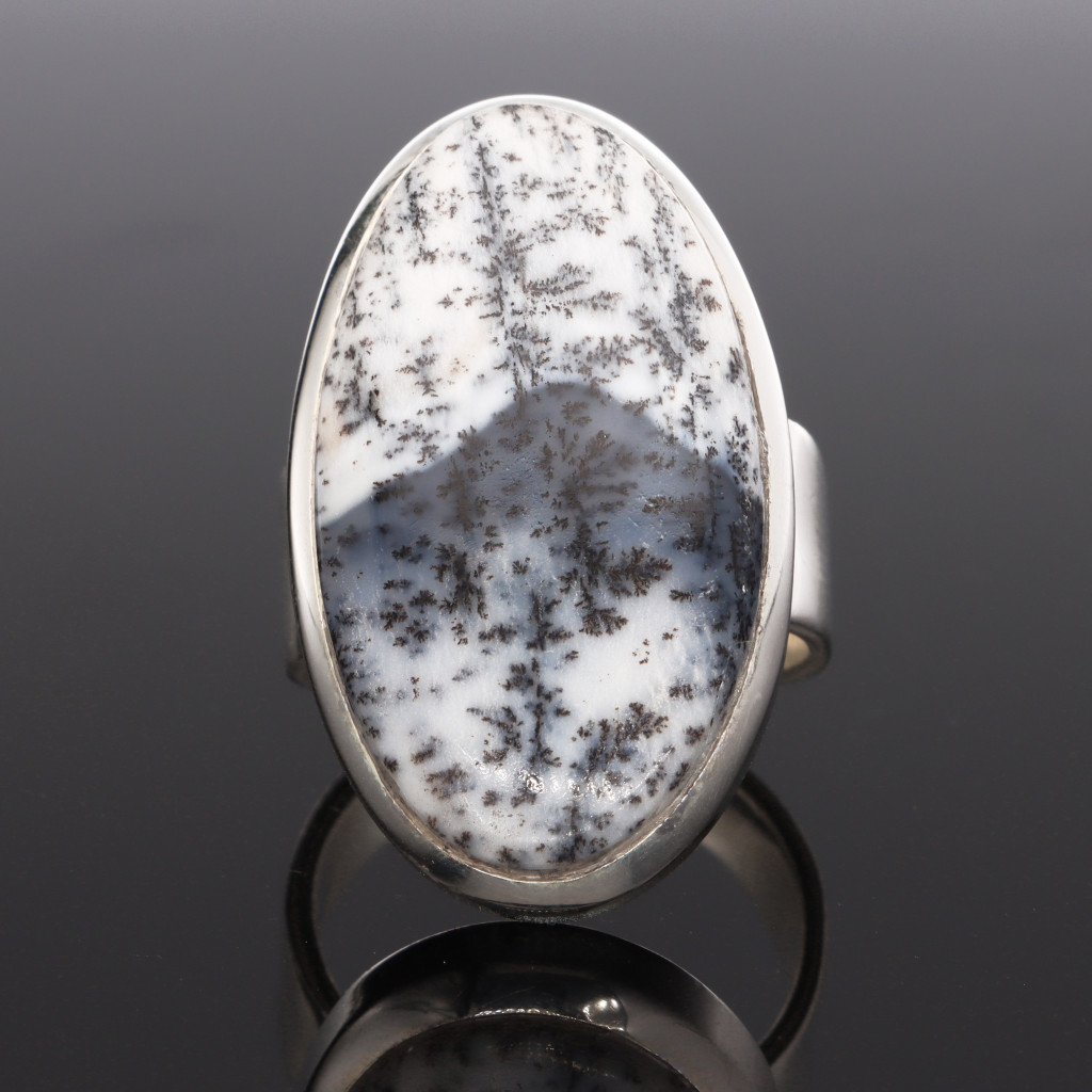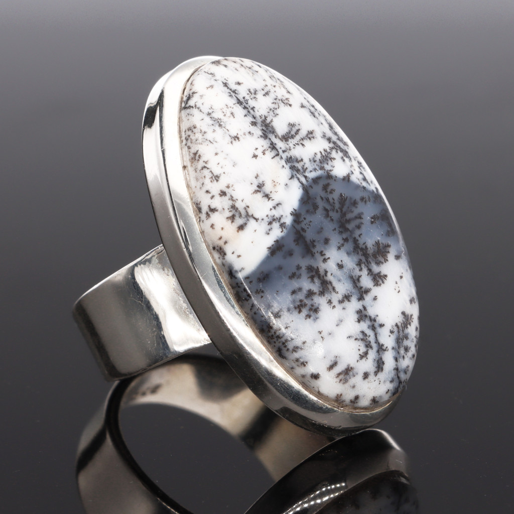 Egyedi ezüst gyűrű, kaboson csiszolású ovális Merlinit (másnéven Dentrit) kővel, letisztult ezüst foglalattal.