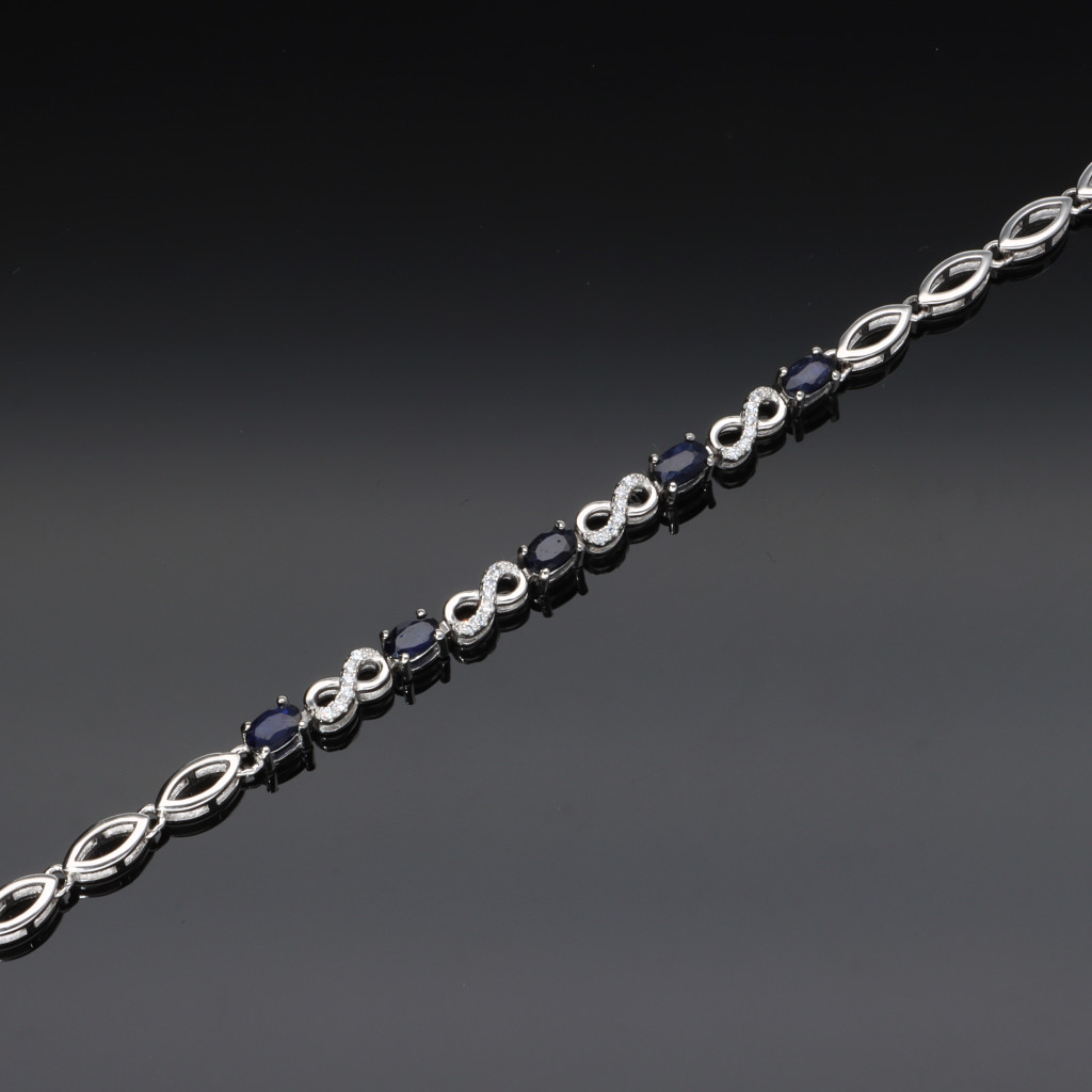 Ezüst karkötő 5 db ovális alakú Zafír kővel, karmos foglalatban, felváltva végtelen formájú, fehér cirkónia kövekkel díszített szemekkel, hosszabbító lánccal.