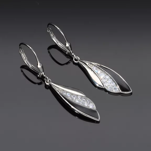 Ezüst patetzáras fülbevaló, lógós kivitelben, fekete zománccal és apró fehér cirkónia kövekkel díszítve