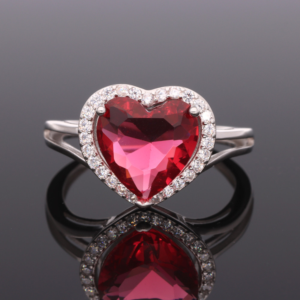 Ragyogjon ezzel a lenyűgöző 925 ezüst gyűrűvel, melynek középpontjában egy hatalmas, 10x10 mm-es piros szív kő tündököl. A központi követ apró, csillogó cirkónia kövek ölelik körbe, fokozva a luxus hatást. Elegáns, keskenyedő sín (alul 2 mm) a kényelemért. Tökéletes ajándék Valentin-napra vagy évfordulóra!