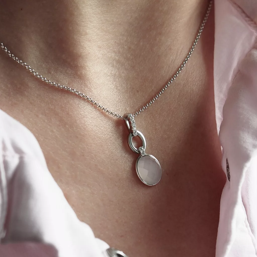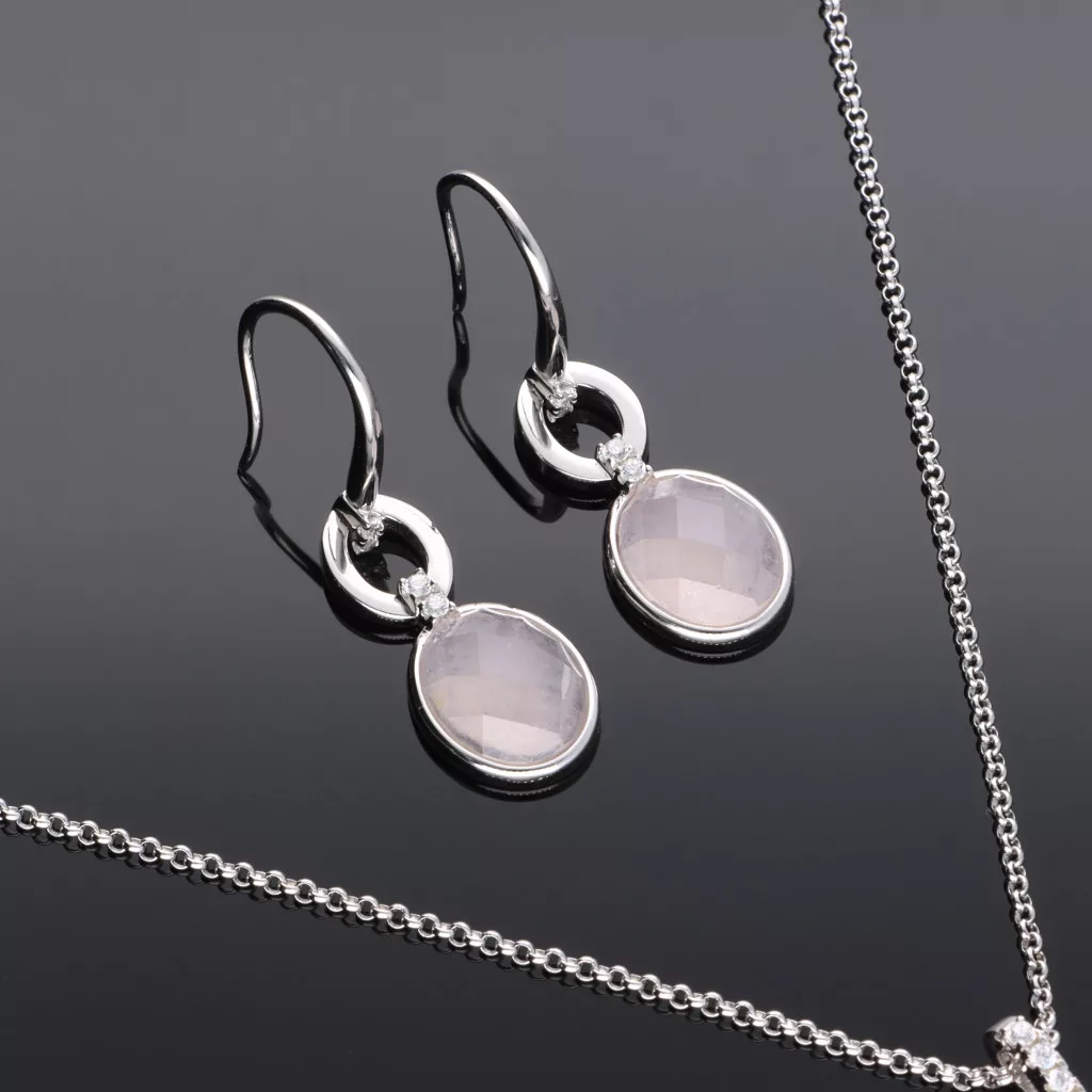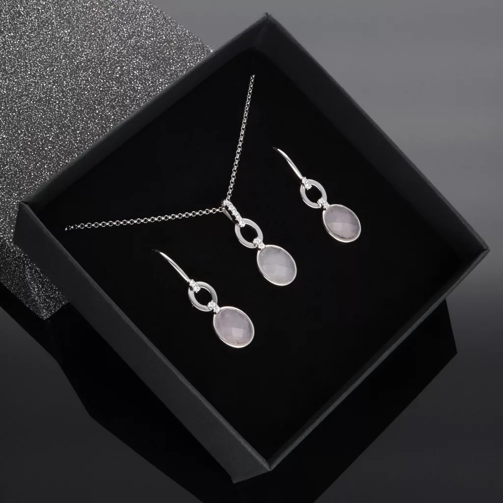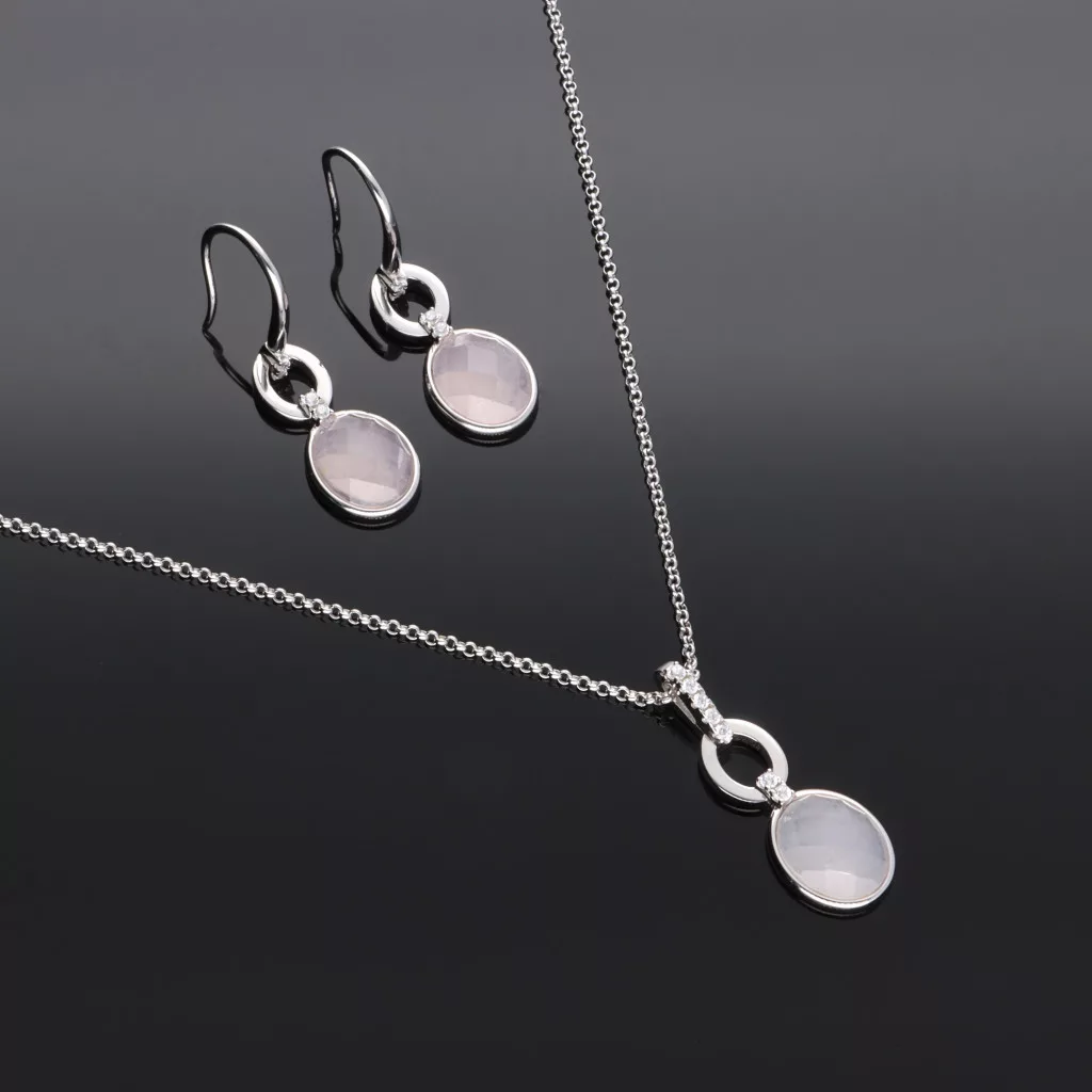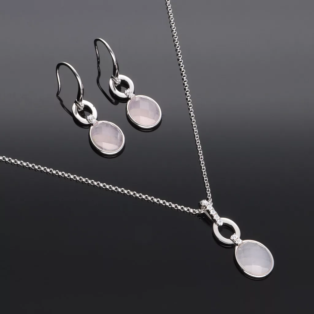A medál és a fülbevaló egy-egy ovális Rózsakvarc ásványból és egy-egy ovális fényes ezüst szemből áll, cirkónia kövekkel díszítve.