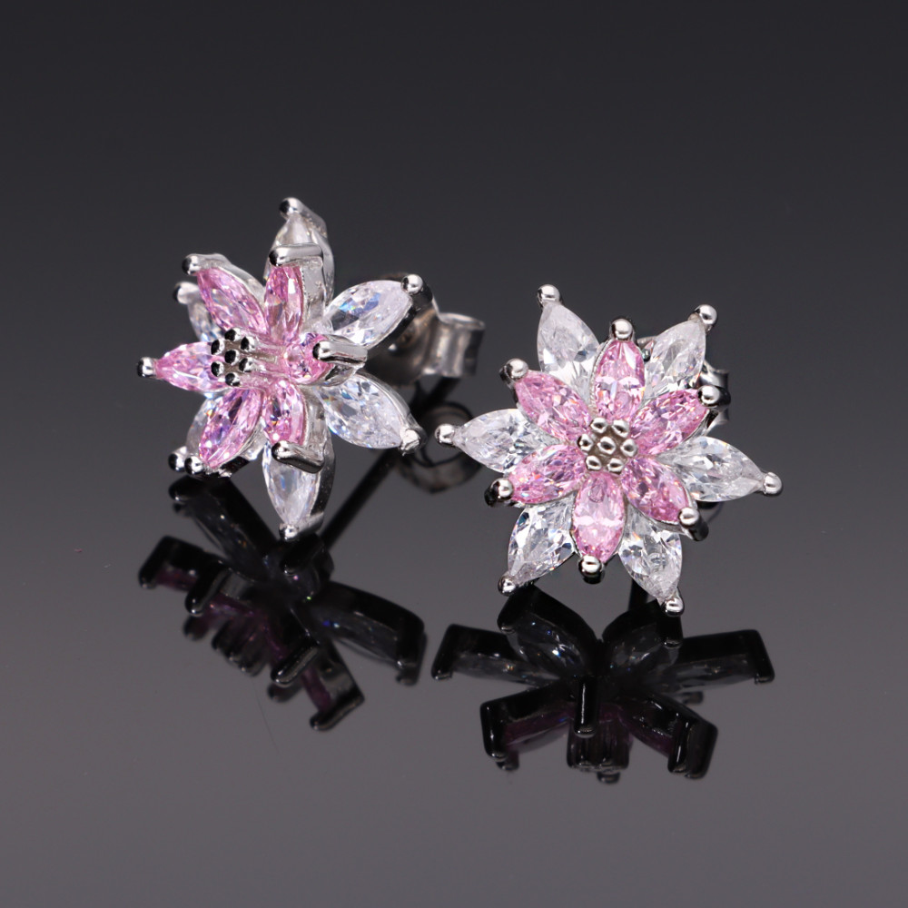 Dupla virág ezüst fülbevaló, a felső 6 szirom rózsaszín, az alsó 6 szirom fehér navett alakú cirkónia kövekből áll, bedugós zárszerkezettel.