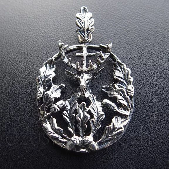 Ezüst szarvas vadász medál, tölgy díszítő elemekkel.