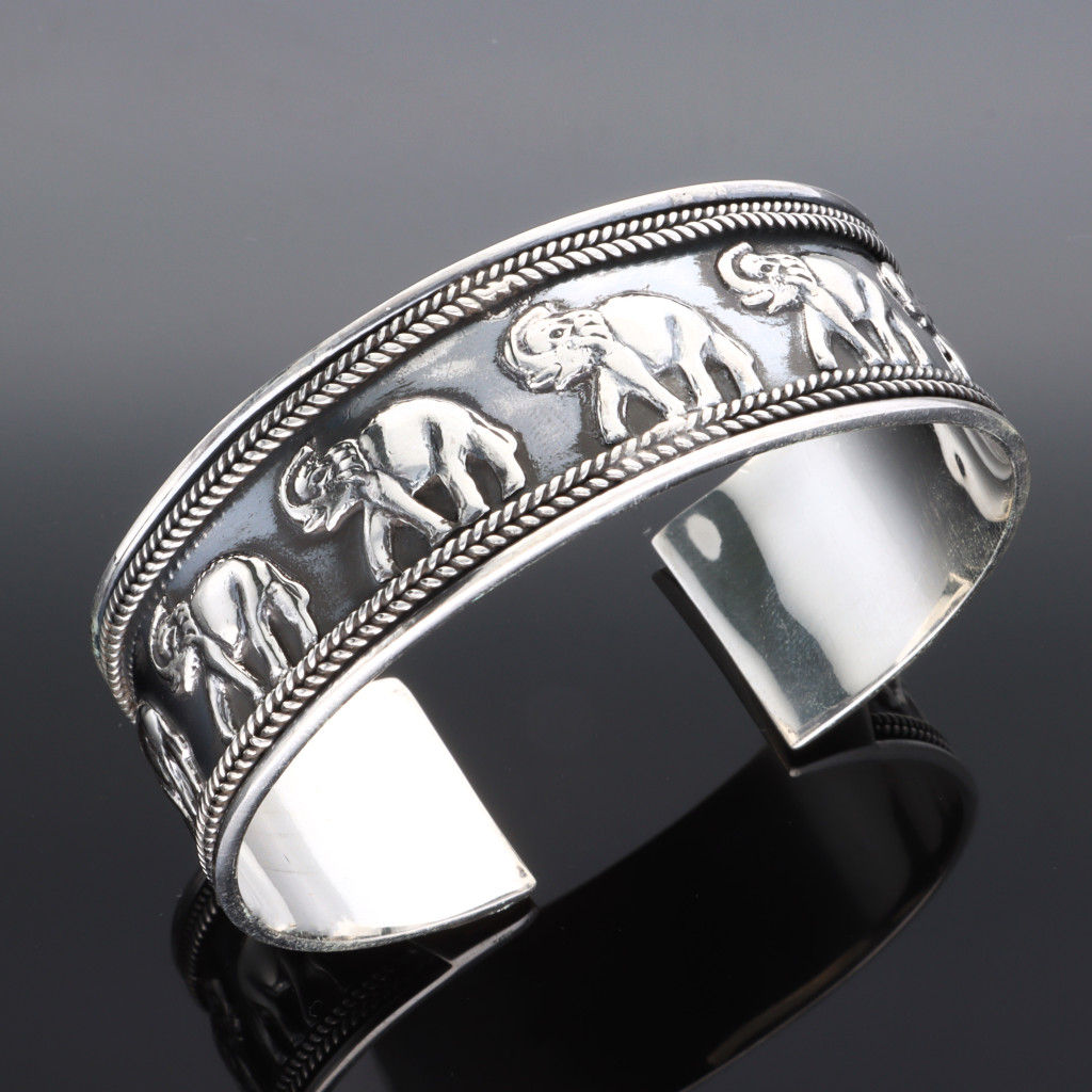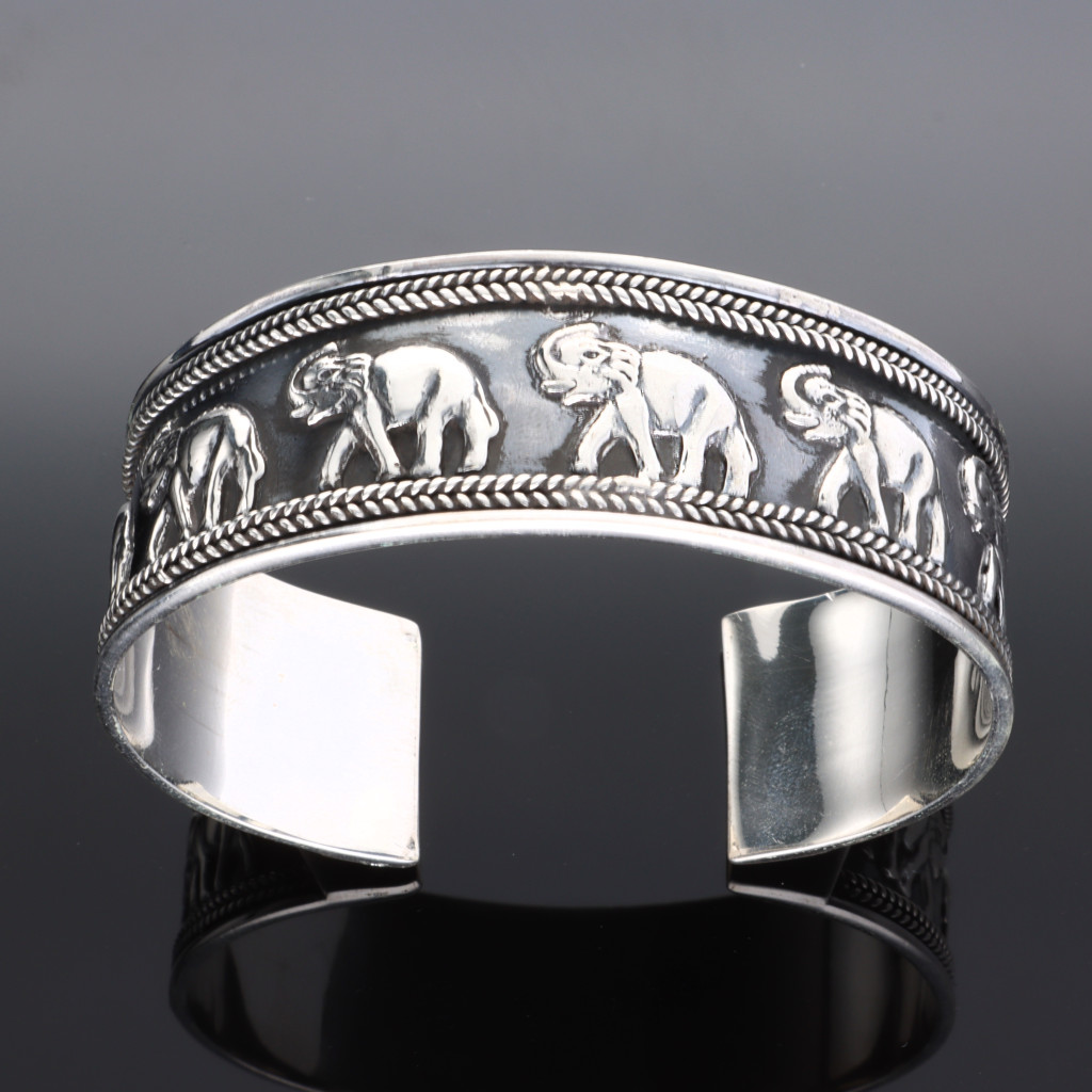 Ezüst merev karkötő, középen elefánt motívumokkal díszítve, szélein fonatos mintázattal