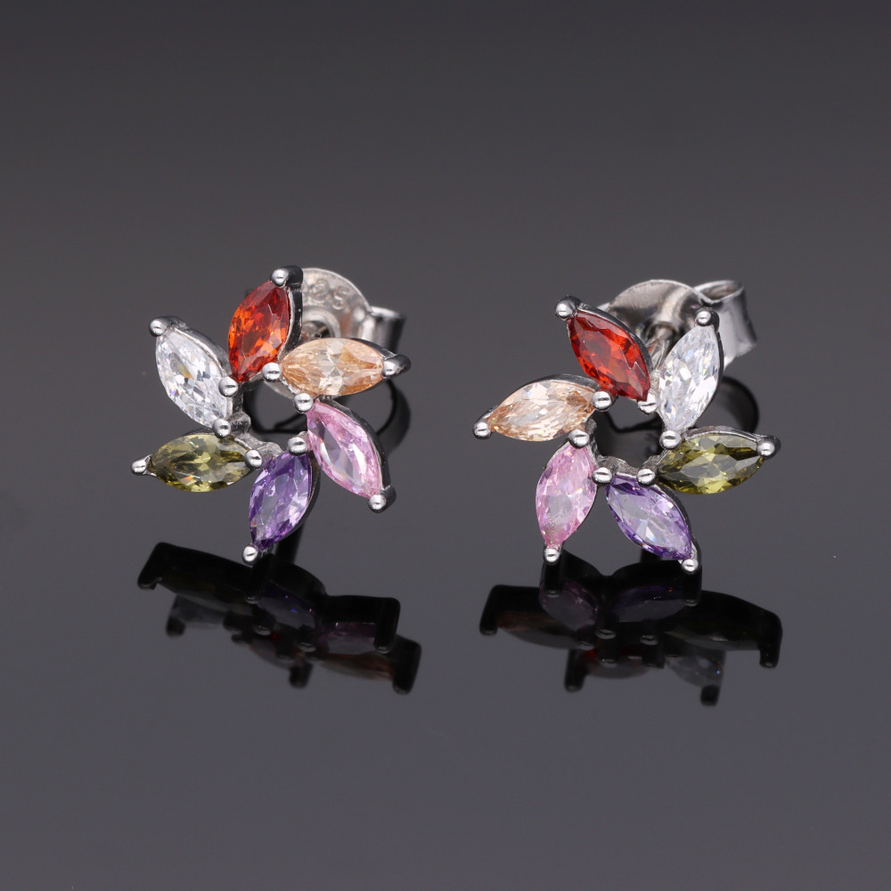 Bedugós ezüst fülbevaló, szélforgót formáló színes navett cirkónia kővekkel, begudógs szerkezettel