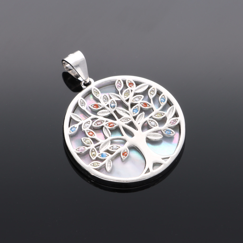 Ezüst medál áttört mintázatú Életfa motívummal, apró színes Cirkónia kövekkel és gyöngyház betéttel
