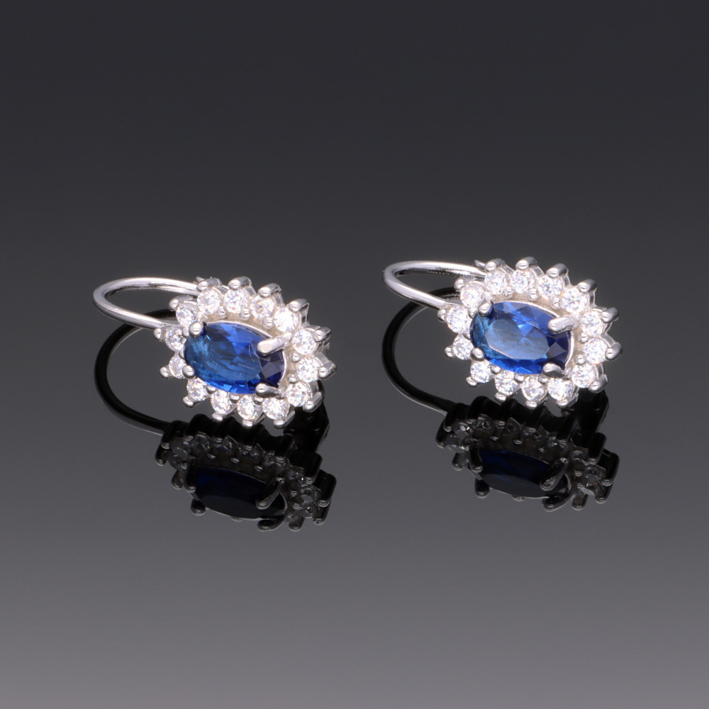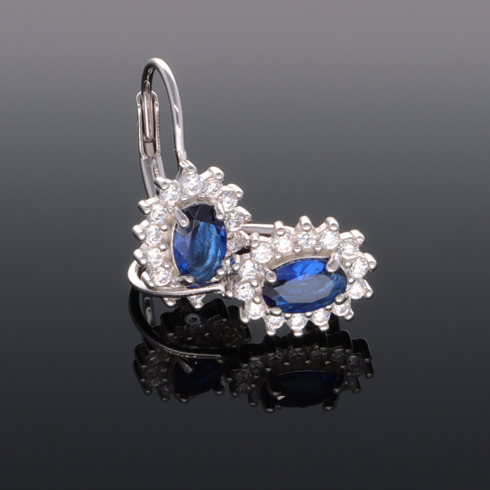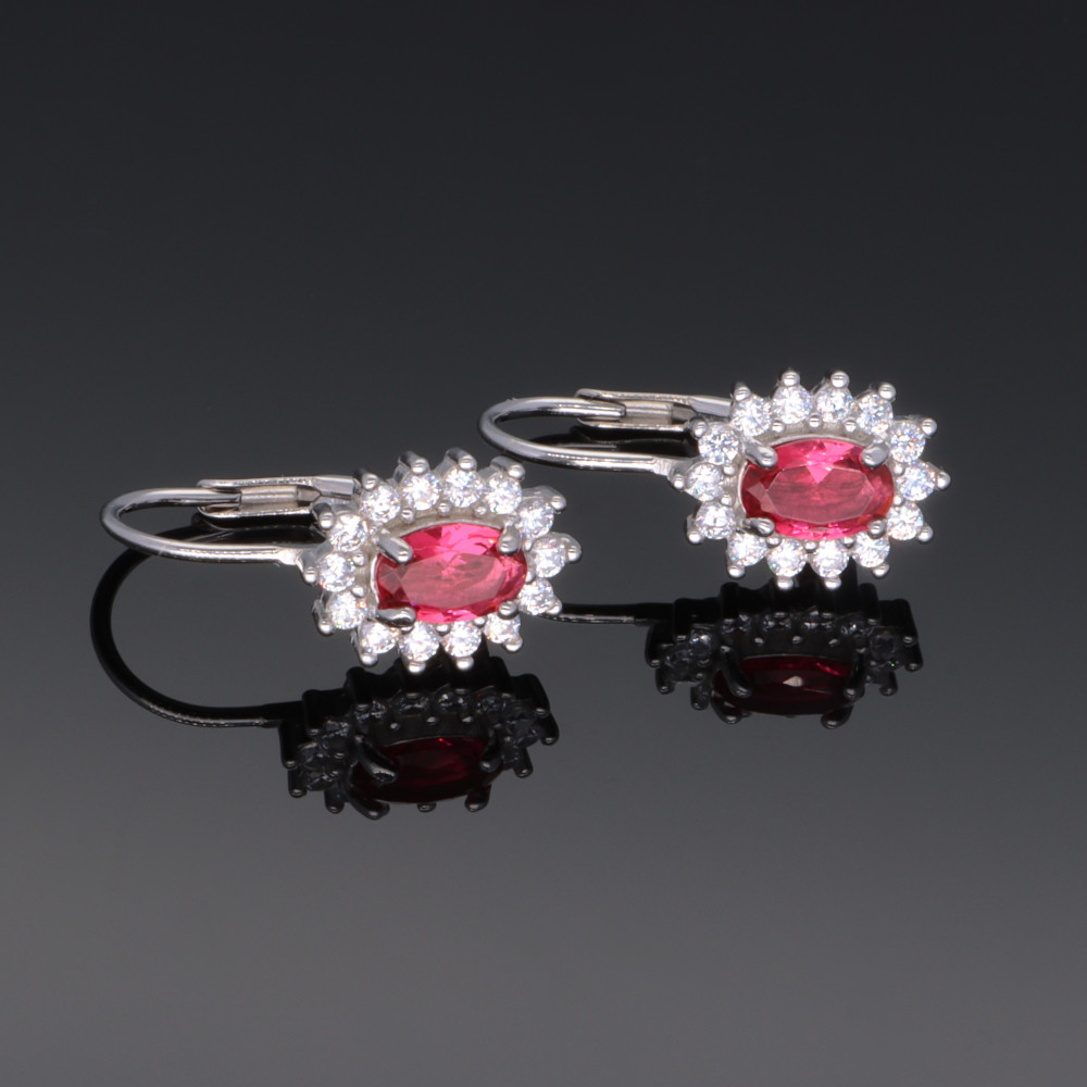 Színes cirkónia kővel készült patentzáras fülbevaló, körben fehér karmos foglalatú kövekkel.