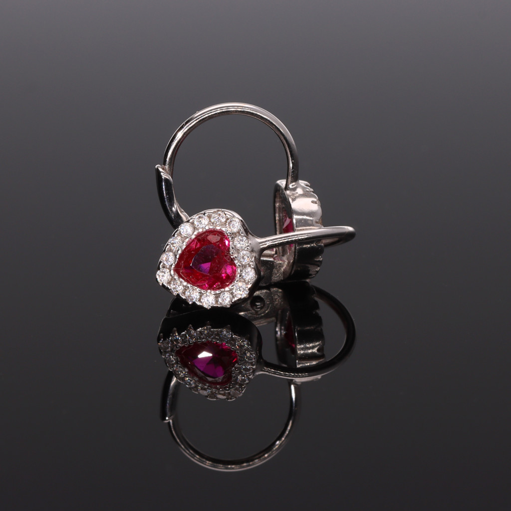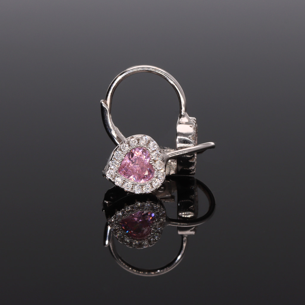 Ezüst patetzáras baba fülbevaló, középen színes szív formájú és körben apró, fehér cirkónia kövekkel díszítve.