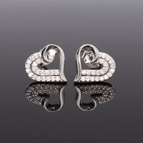 Dupla szív Ezüst fülbevaló, az egyik oldalon dupla, Cirkónia köves szárral, a másik oldalon szimpla, enyhén domborított, extra fényes szárral