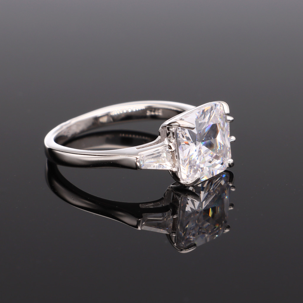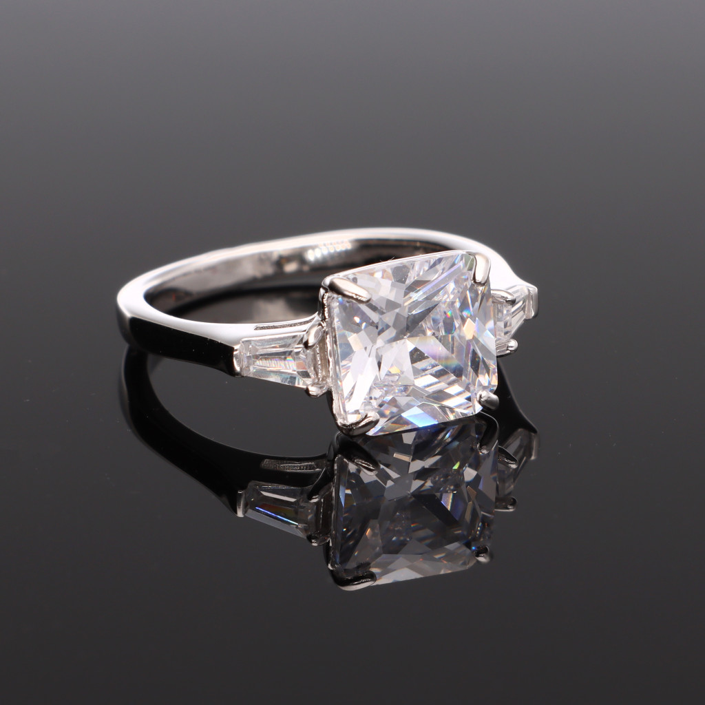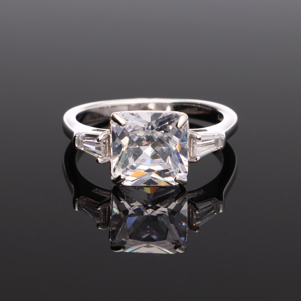 Ezüst gyűrű, nagy négyzet formájú Cirkónia kővel, karmos foglalatban, amelynek két oldalát egy-egy trapéz kő díszíti