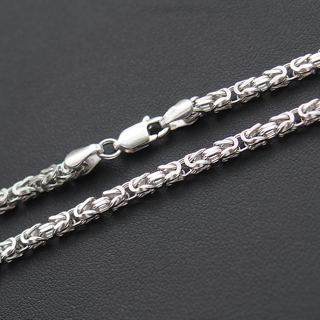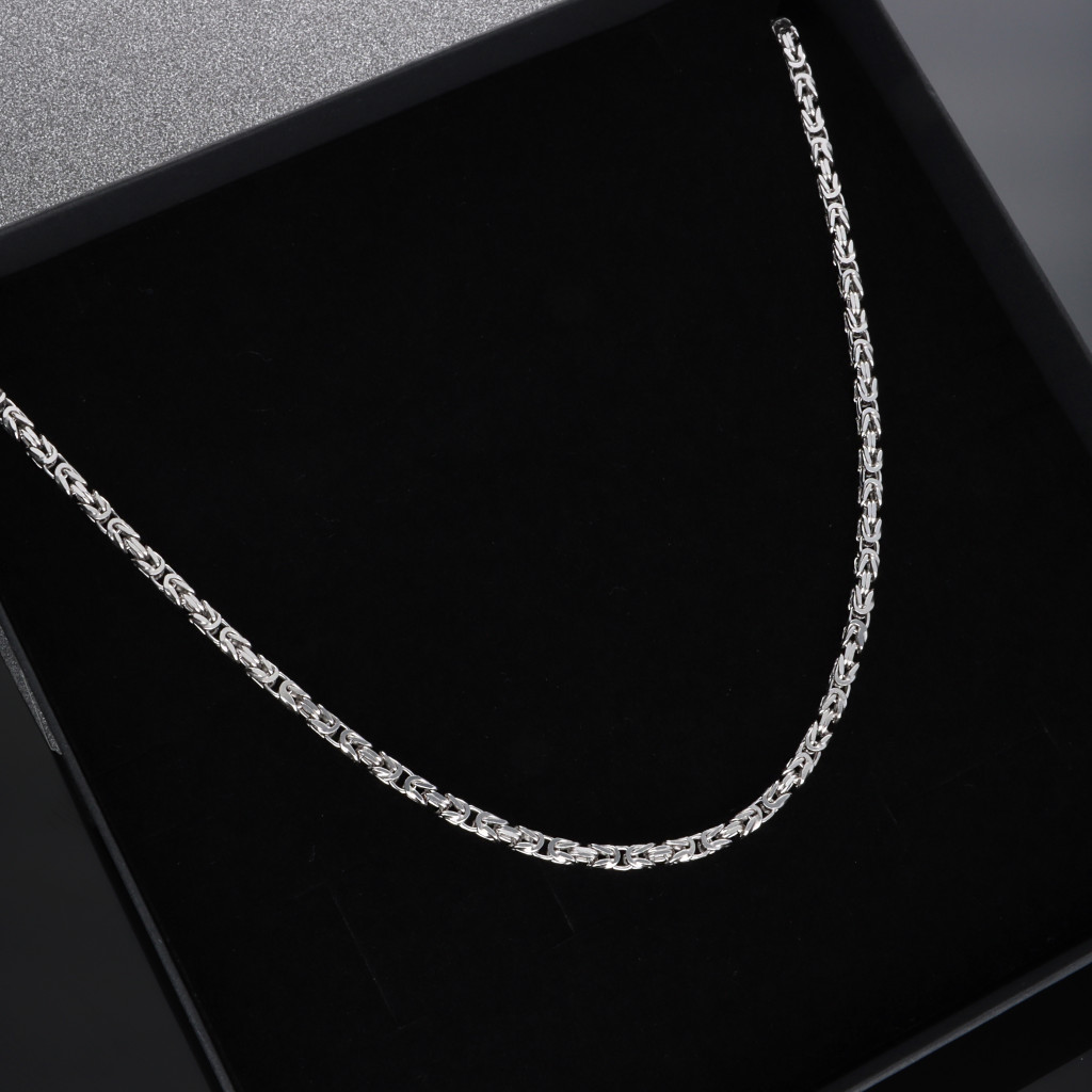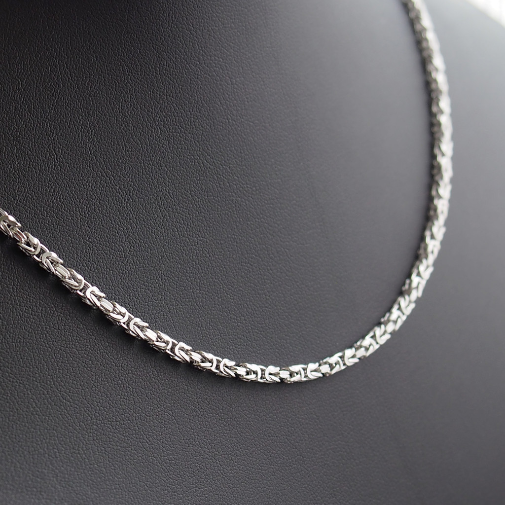 Tömör, laza szemezésű, ródiumozott szögletes ezüst királylánc.