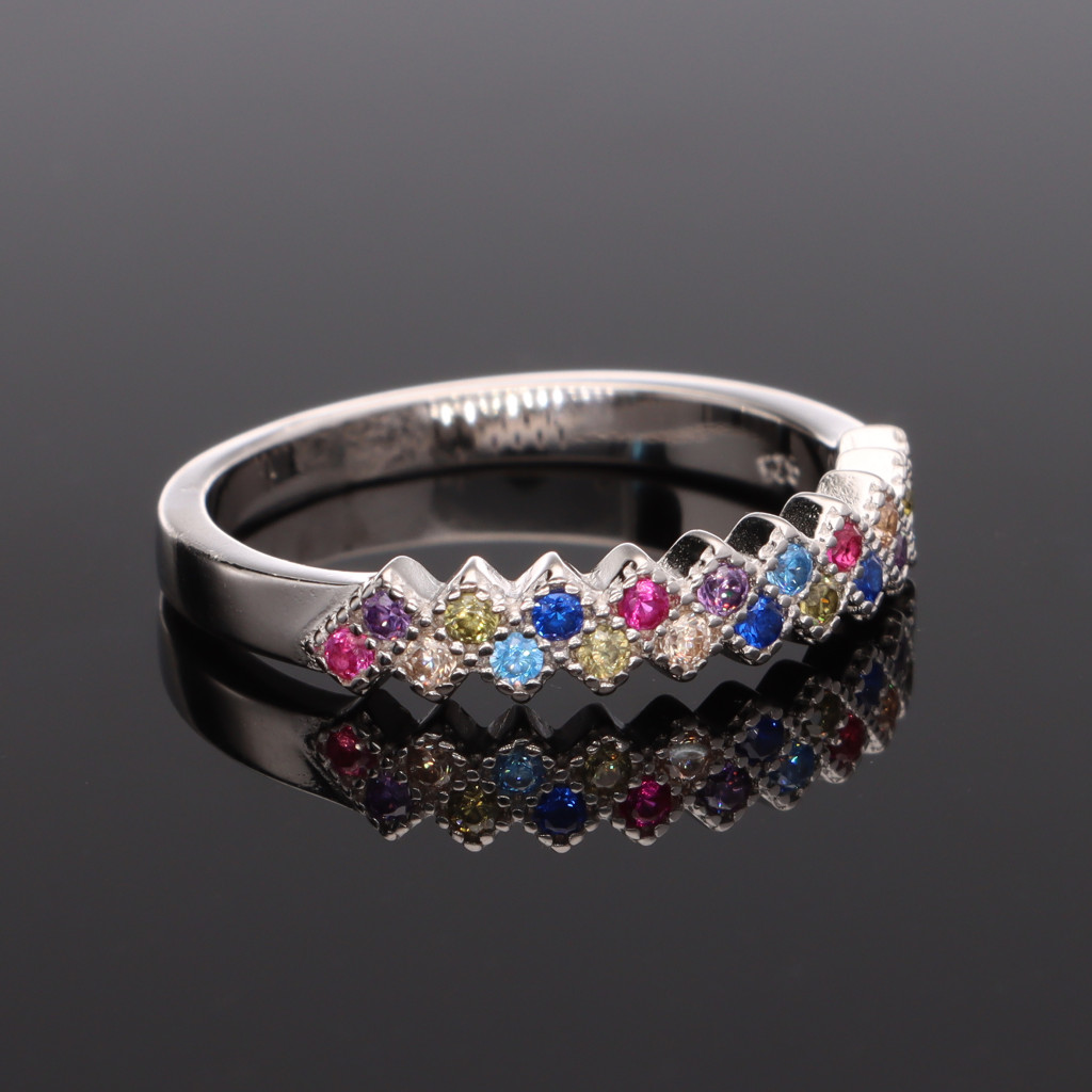 Ezüst gyűrű, különböző színű cirkónia kövekkel díszítve, két soros, élére állított négyzetes foglalatokban.