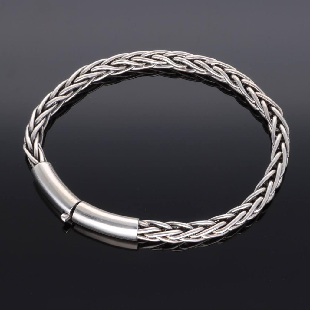Tömör, antikolt fonott ezüst karkötő, fényes ezüst nyelveszáras betéttel