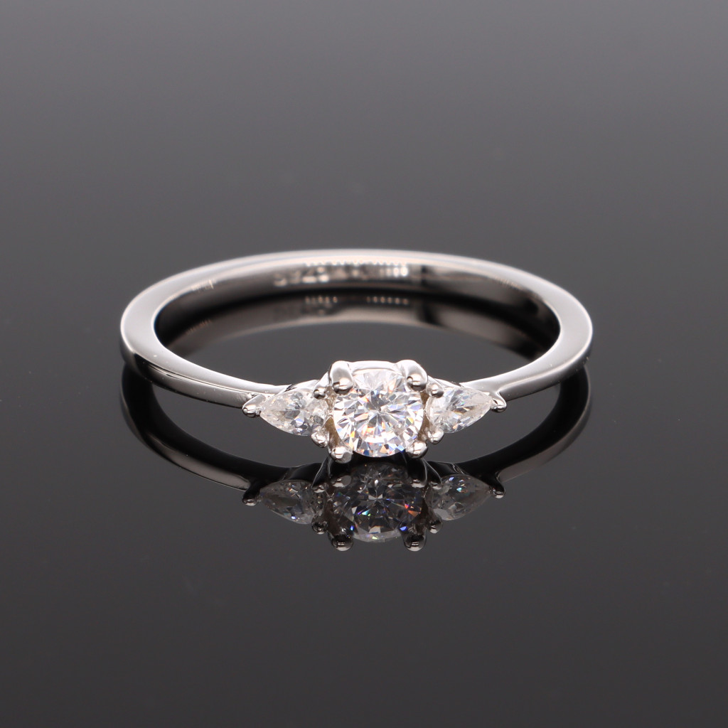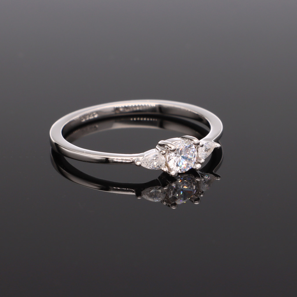 Ezüst gyűrű, egy kerek és két oldalán egy-egy csepp alakú Cirkónia kővel