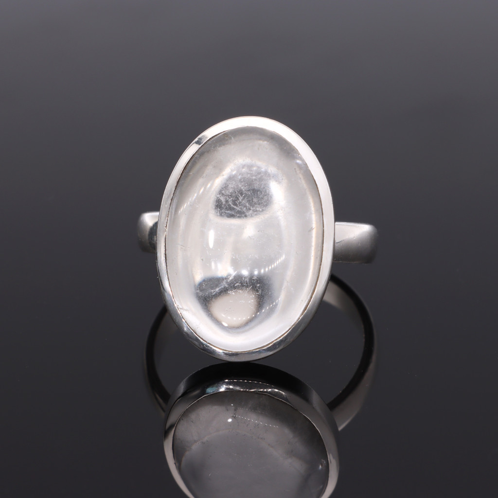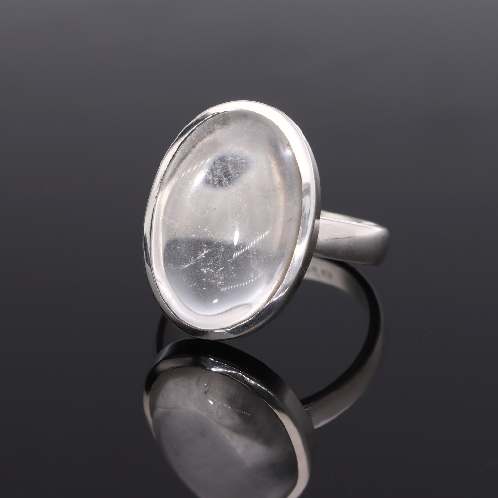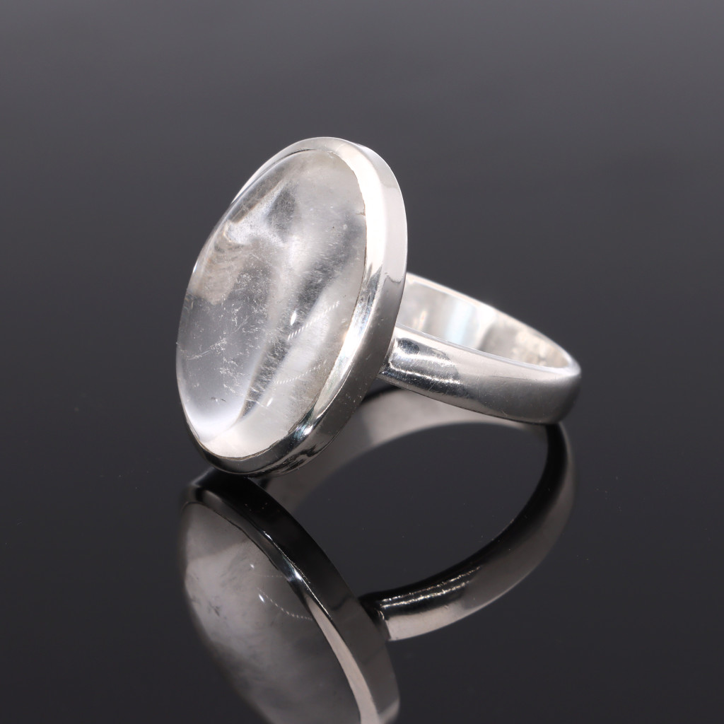 Egyedi ezüst gyűrű, ovális, kaboson csiszolású hegyikristály kővel.