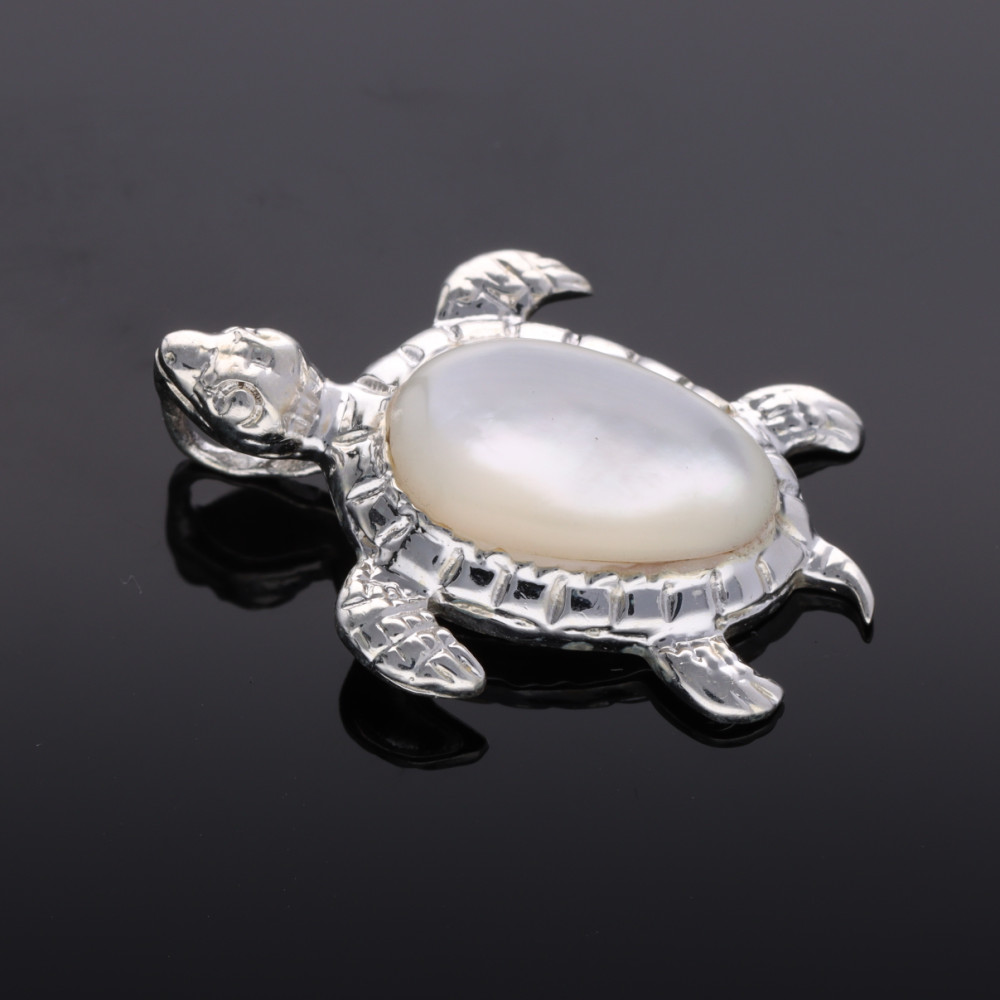 Ezüst teknős medál, melynek páncélja gyöngyház berakással készüt.