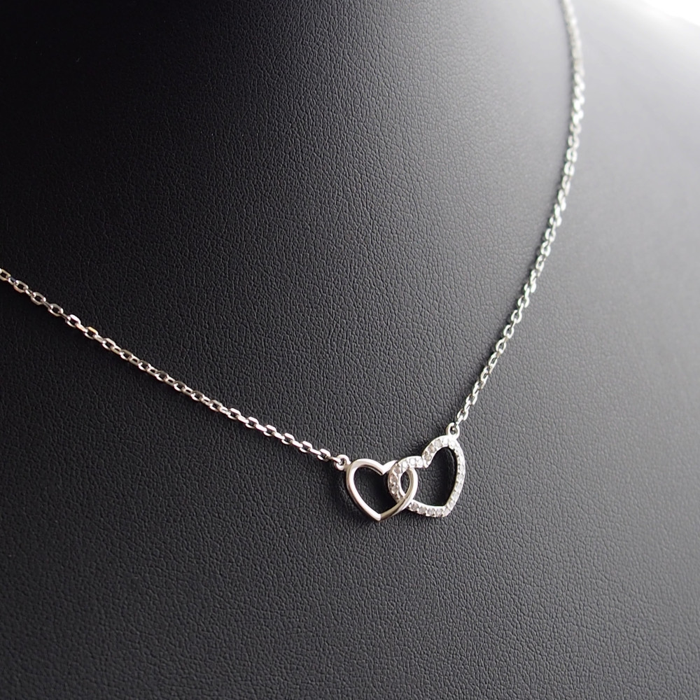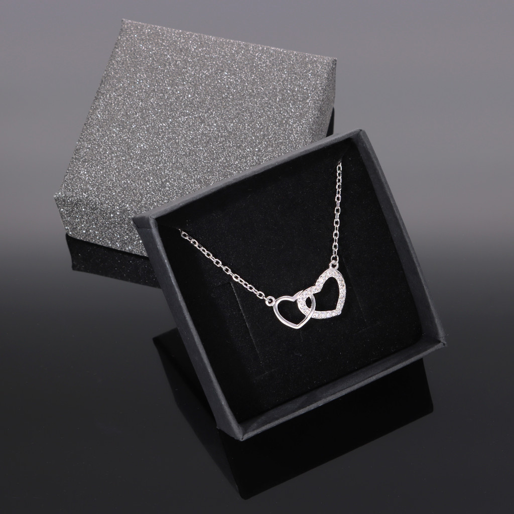 A nagyobb szív apró cirkónia kövekkel foglalva, a kissebb fényes felülettel.